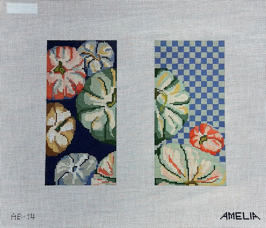 This hand painted two sided eyeglass case needlepoint canvas from The Gingham Stitchery features colorful pumpkins and a coordinating checkered background.