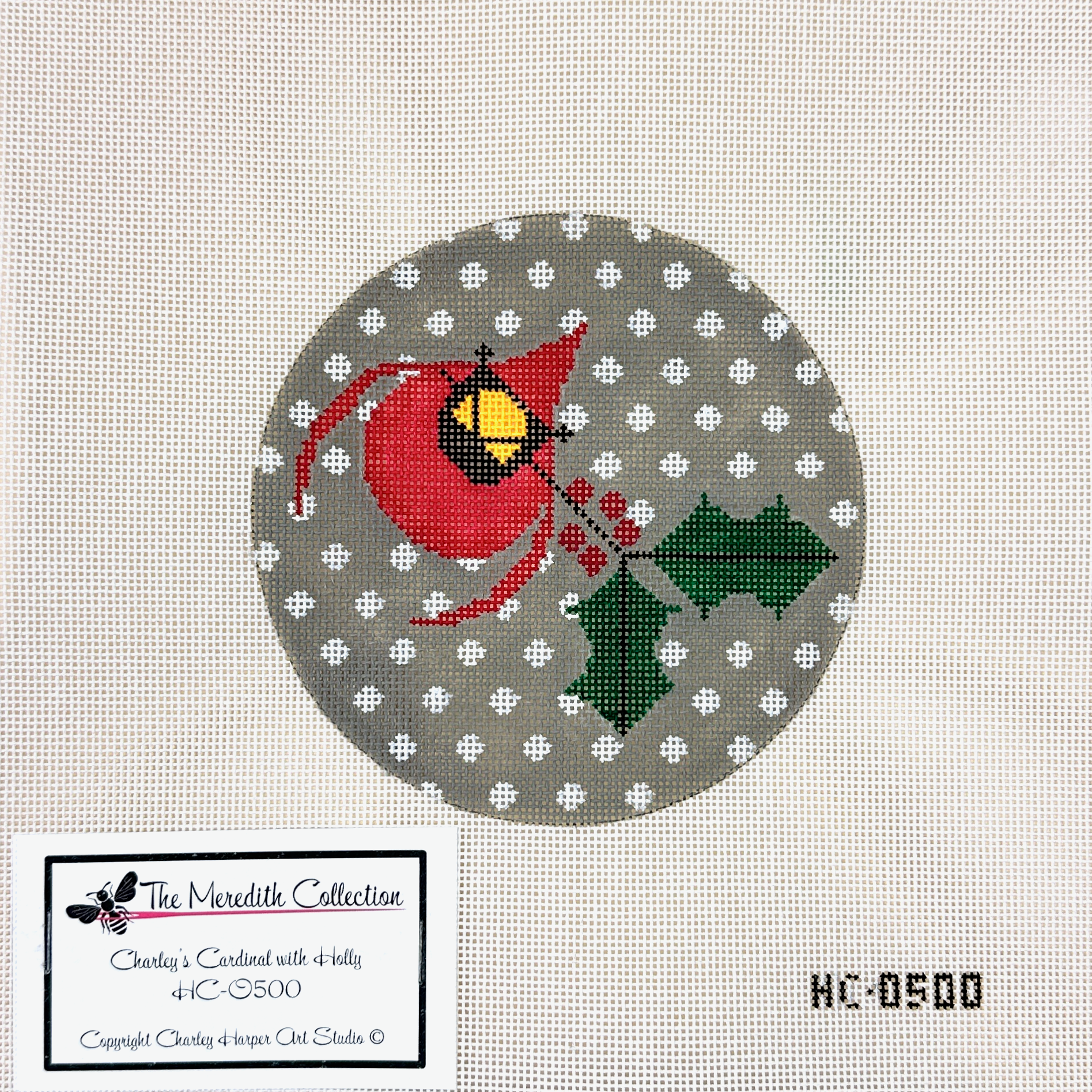 This needlepoint canvas by Charley Harper from The Meredith Collection features a cardinal in flight with a bushel of holly in tow.