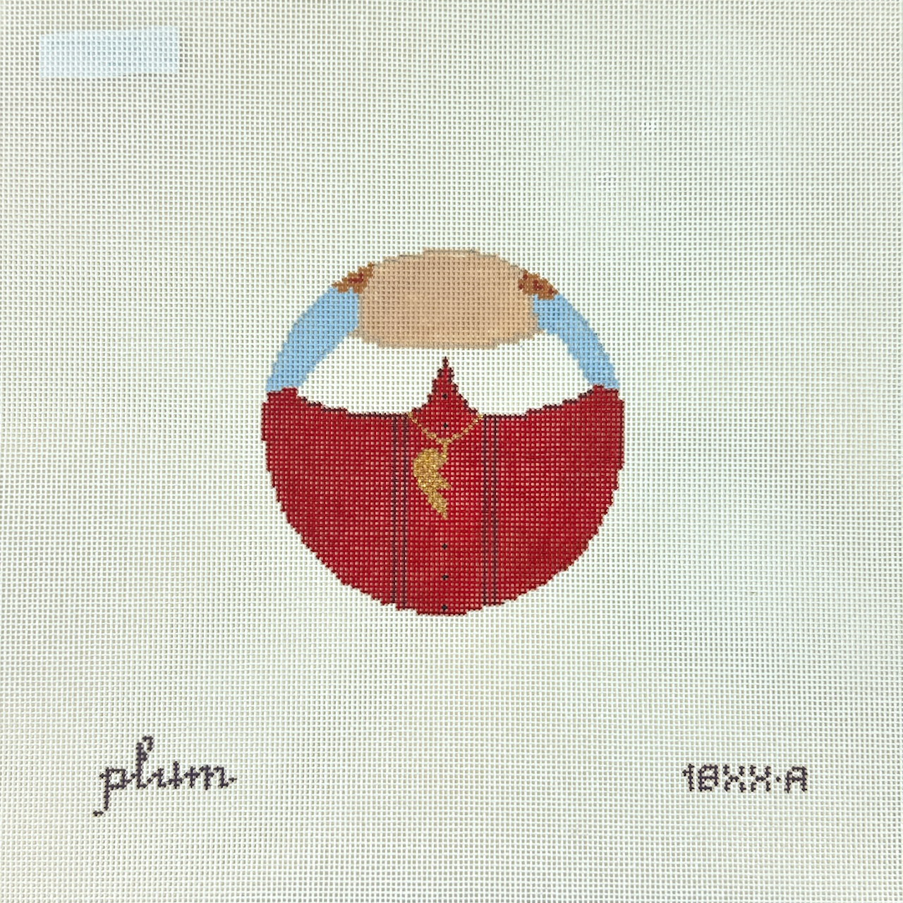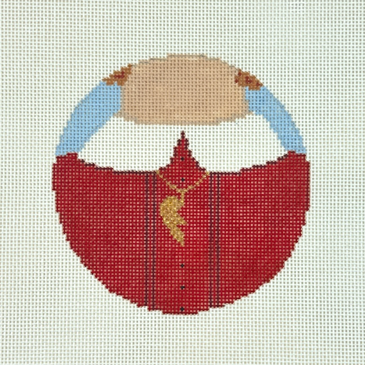 This is a hand painted needlepoint canvas by The Plum Stitchery. It features a close up of Annie's iconic white collared red dress and gold locket.