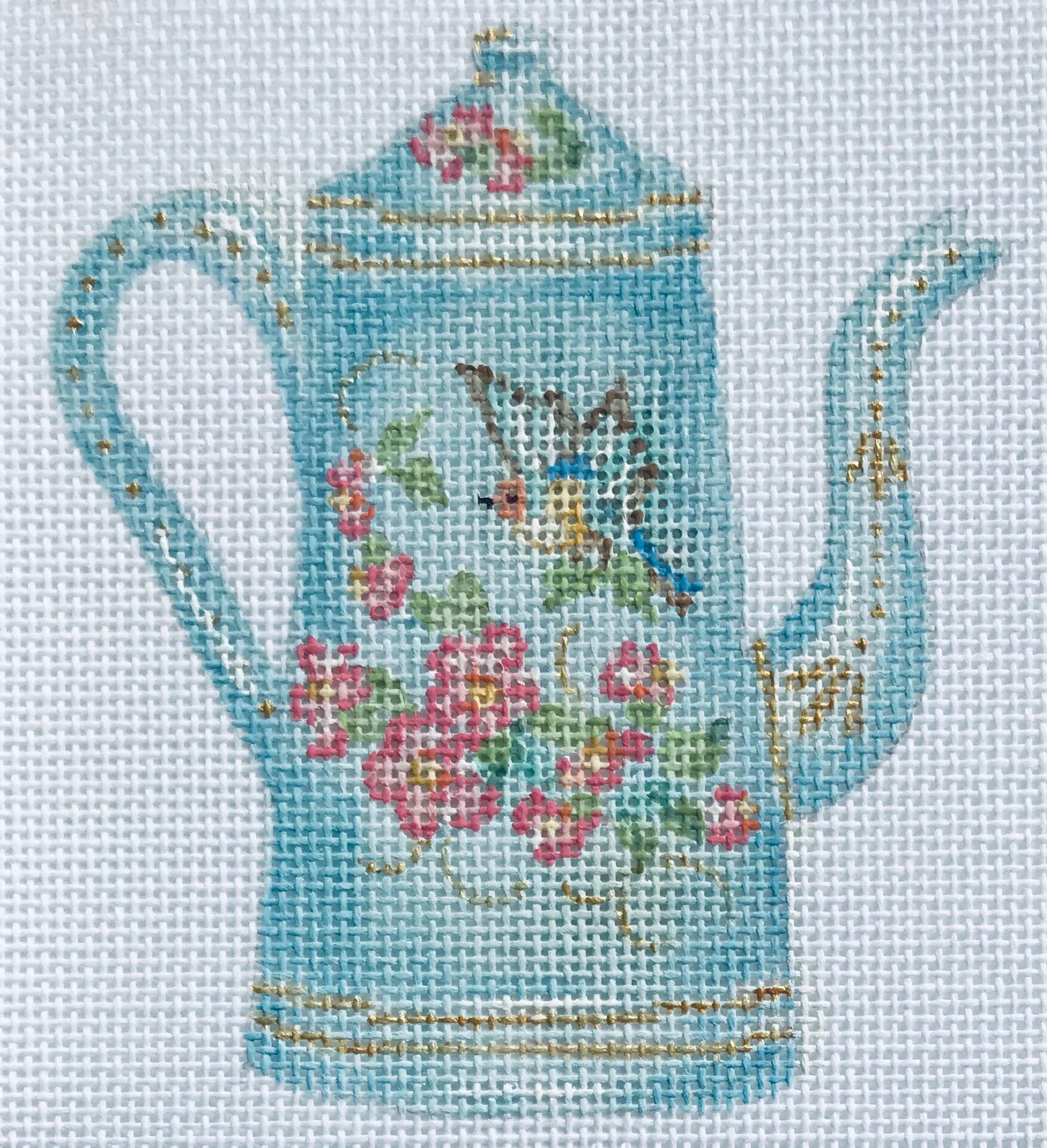 From The Stitched Garden for Plum Stitchery, this hand painted needlepoint canvas features a lovely vintage coffee pot in blue with pink flowers and a bluebird. The Stitched Garden needlepoint designs are the creation of long-time needlepoint painter artists Betsy Duggan and Maureen Bingle.
