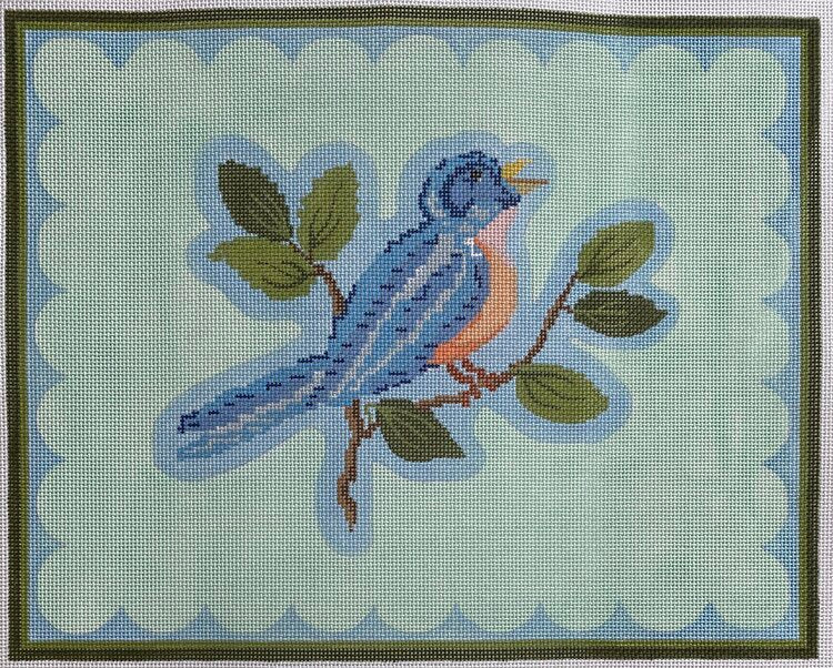 This is a hand painted needlepoint canvas by the Plum Stitchery. This canvas features a painting of a bluebird calling, set to a blue and green background. The Stitched Garden needlepoint designs are the creation of long-time needlepoint painter artists Betsy Duggan and Maureen Bingle.