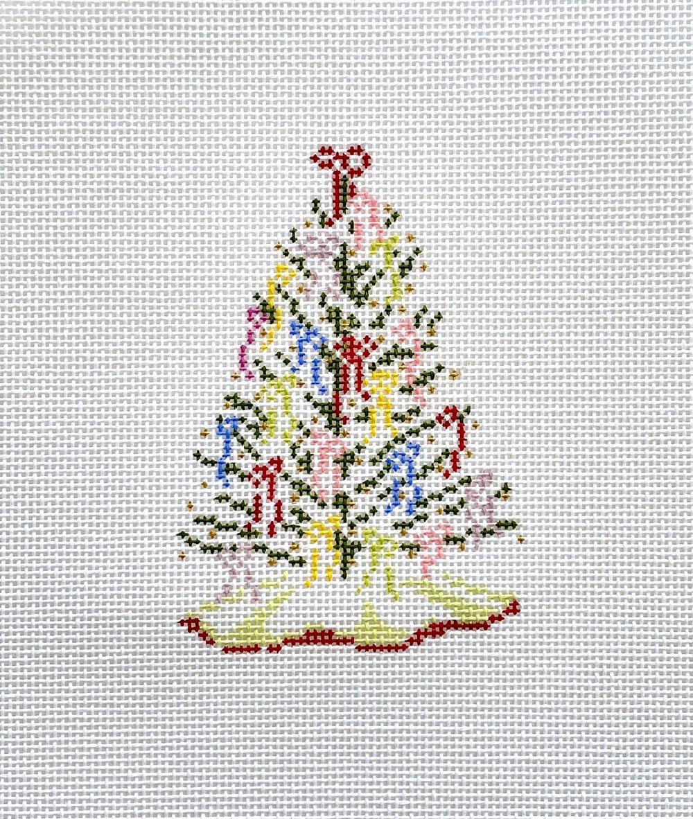 This hand painted canvas by The Plum Stitchery features a lovely Christmas tree tied with multi colored bows.