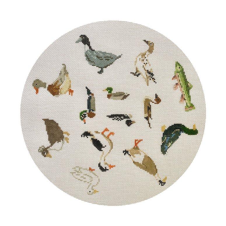 This hand painted needlepoint canvas by The Plum Stitchery features a cheeky design with a circle of different ducks with one trout.
