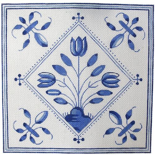 This is a hand painted needlepoint canvas by the Plum Stitchery. This canvas features a tile design with a floral pattern painted on it. The Stitched Garden needlepoint designs are the creation of long-time needlepoint painter artists Betsy Duggan and Maureen Bingle.