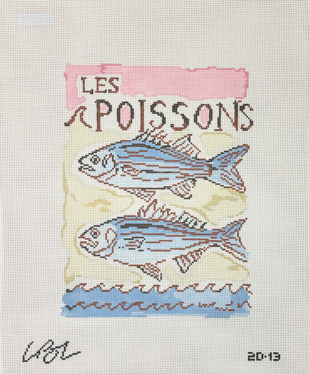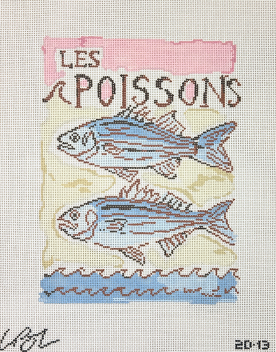 This is a hand painted needlepoint canvas by Lia Burke Libaire from the Plum Stitchery. This canvas features a painting of a two fish on a neopolitan background, with "Les Poissons" written above them.