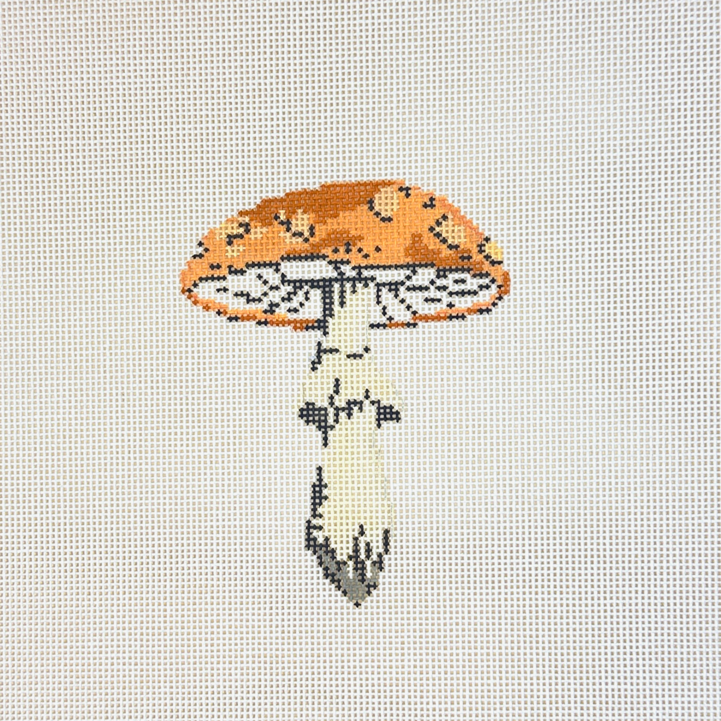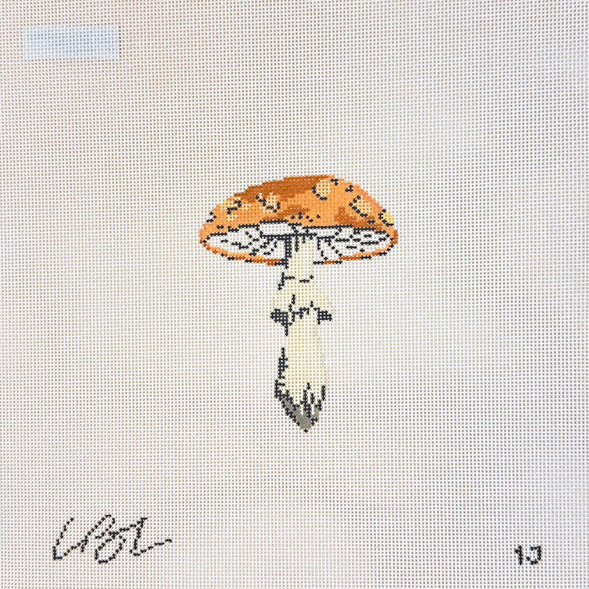 This is a hand painted needlepoint canvas by Lia Burke Libaire from the Plum Stitchery. This canvas features an orange mushroom set to a plain background.