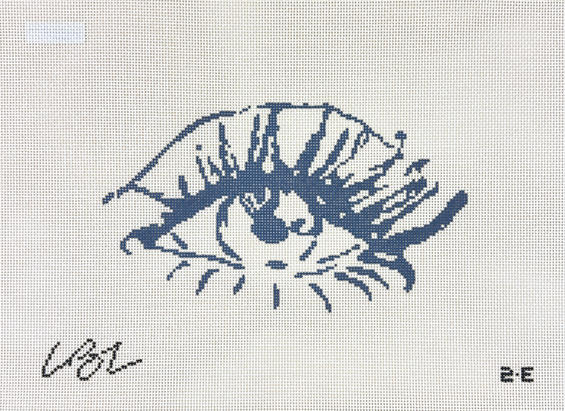 This is a hand painted needlepoint canvas by Lia Burke Libaire from the Plum Stitchery. This canvas features an artistic depiction of an eye and eyelashes, set to a plain background.