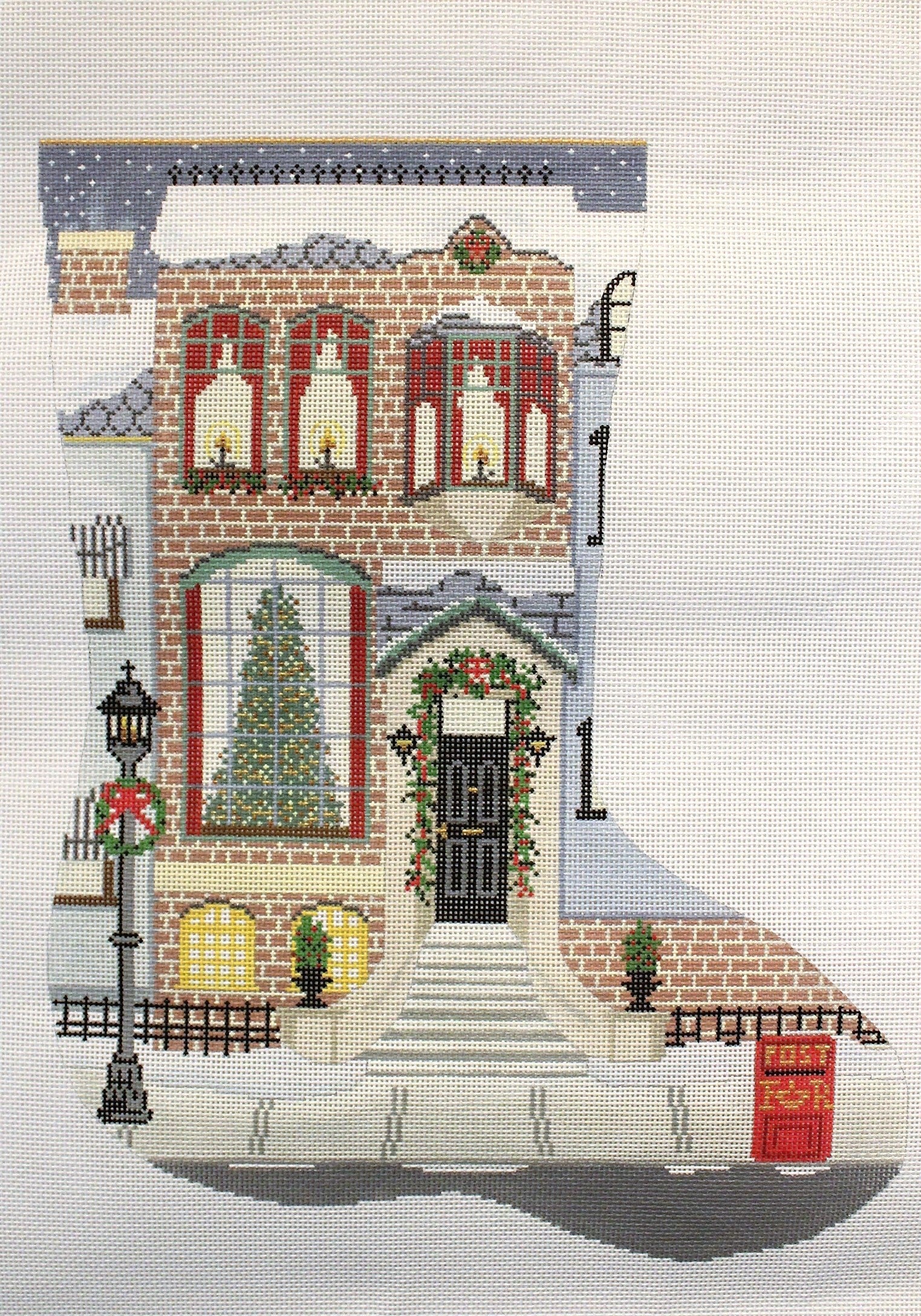 A welcoming London brownstone decked out in Christmas finery is the star of this hand painted stocking needlepoint canvas by Plum Stitchery.