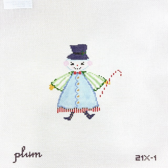 This hand painted needlepoint canvas by The Plum Stitchery features and utterly charming snow person in a blue coat with green striped sleeves.