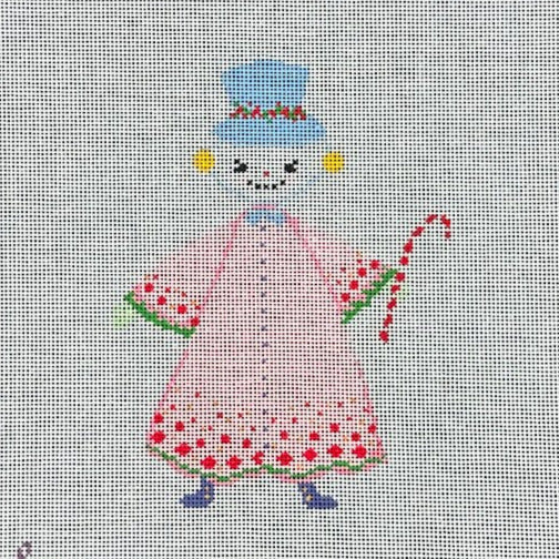 This hand painted needlepoint canvas by The Plum Stitchery features and utterly charming snow person in a pink coat with red dots.