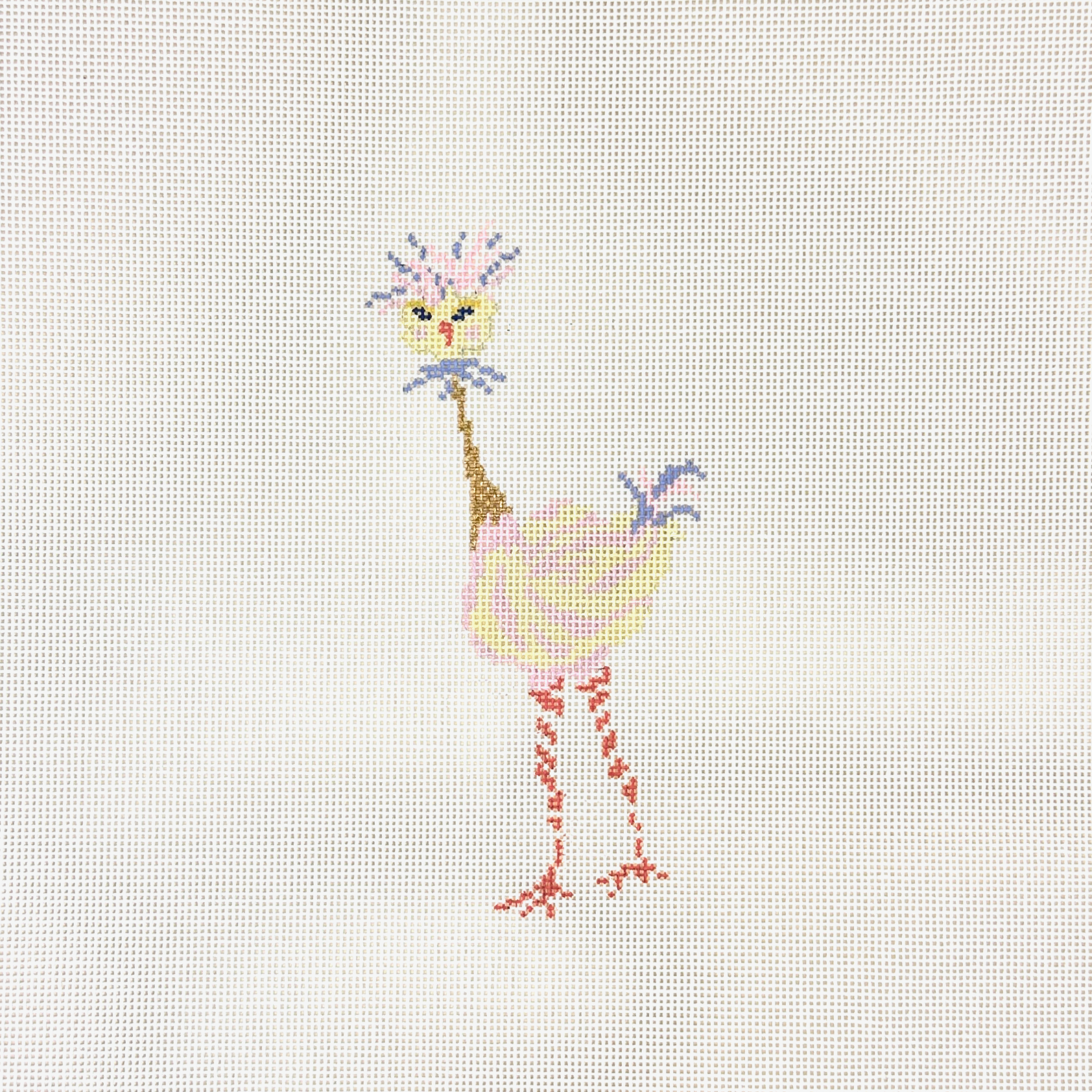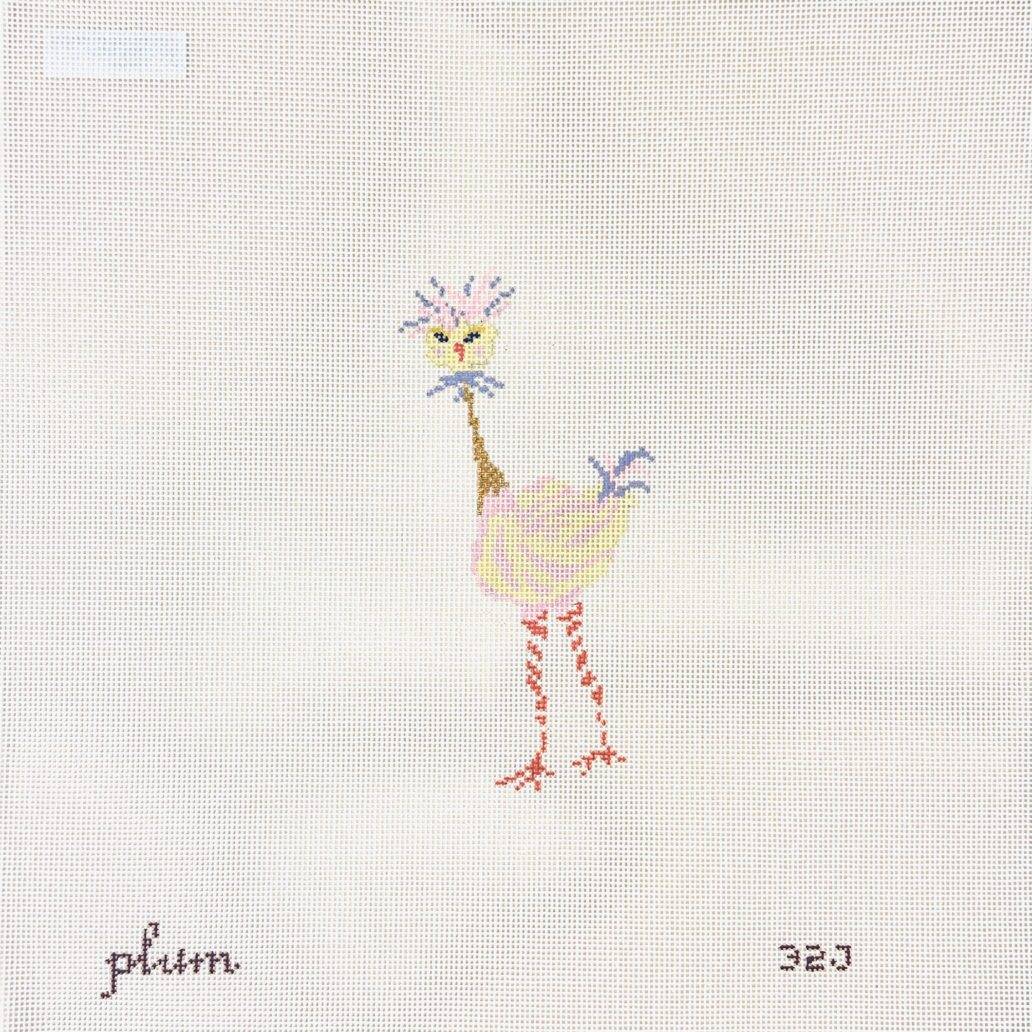 This hand painted needlepoint canvas by The Plum Stitchery features a funky bird in pink and yellow with red striped legs.