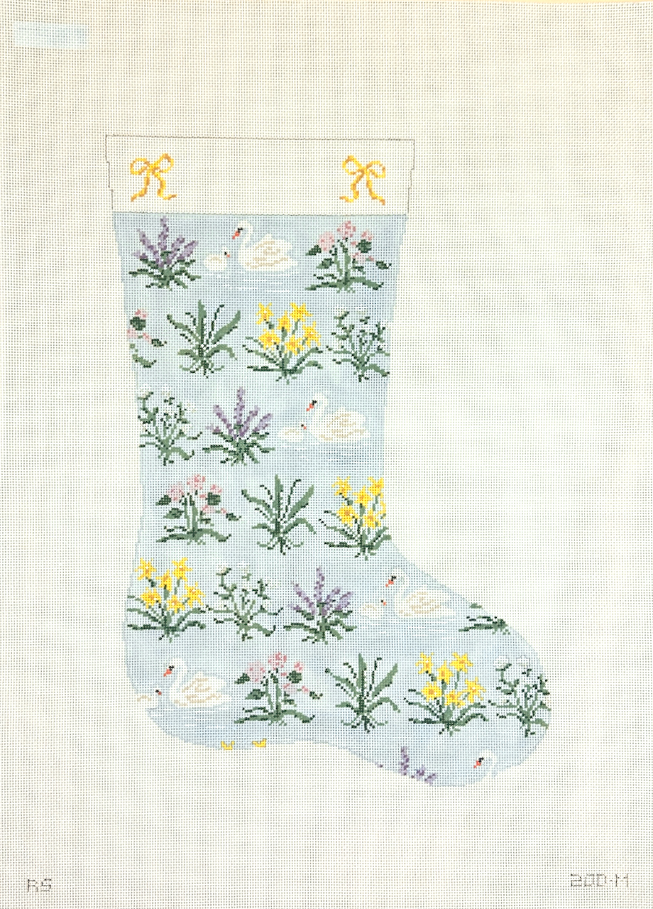 This is a hand painted needlepoint canvas by The Plum Stitchery. It finishes as a midi stocking and features a lovely floral pattern on a seafoam green background, punctuated by swans.