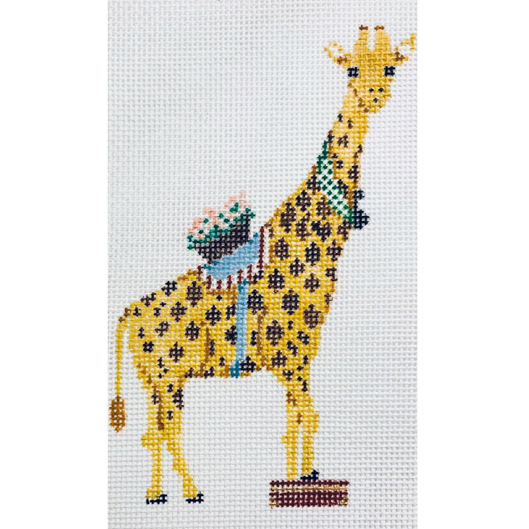 From the Menagerie collection by The Plum Stitchery, this hand painted needlepoint canvas features a charming giraffe with a neckerchief and suitcase.