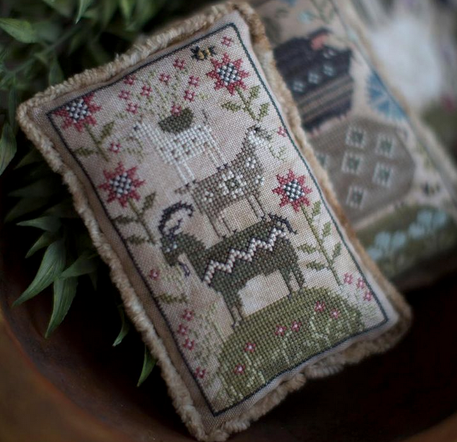 This cross stitch pattern from Plum Street Samplers features a stack of cute goats. The model stitched over two on 36 Ct Oaken by Picture this Plus using Weeks Dye Works & Classic colorworks.