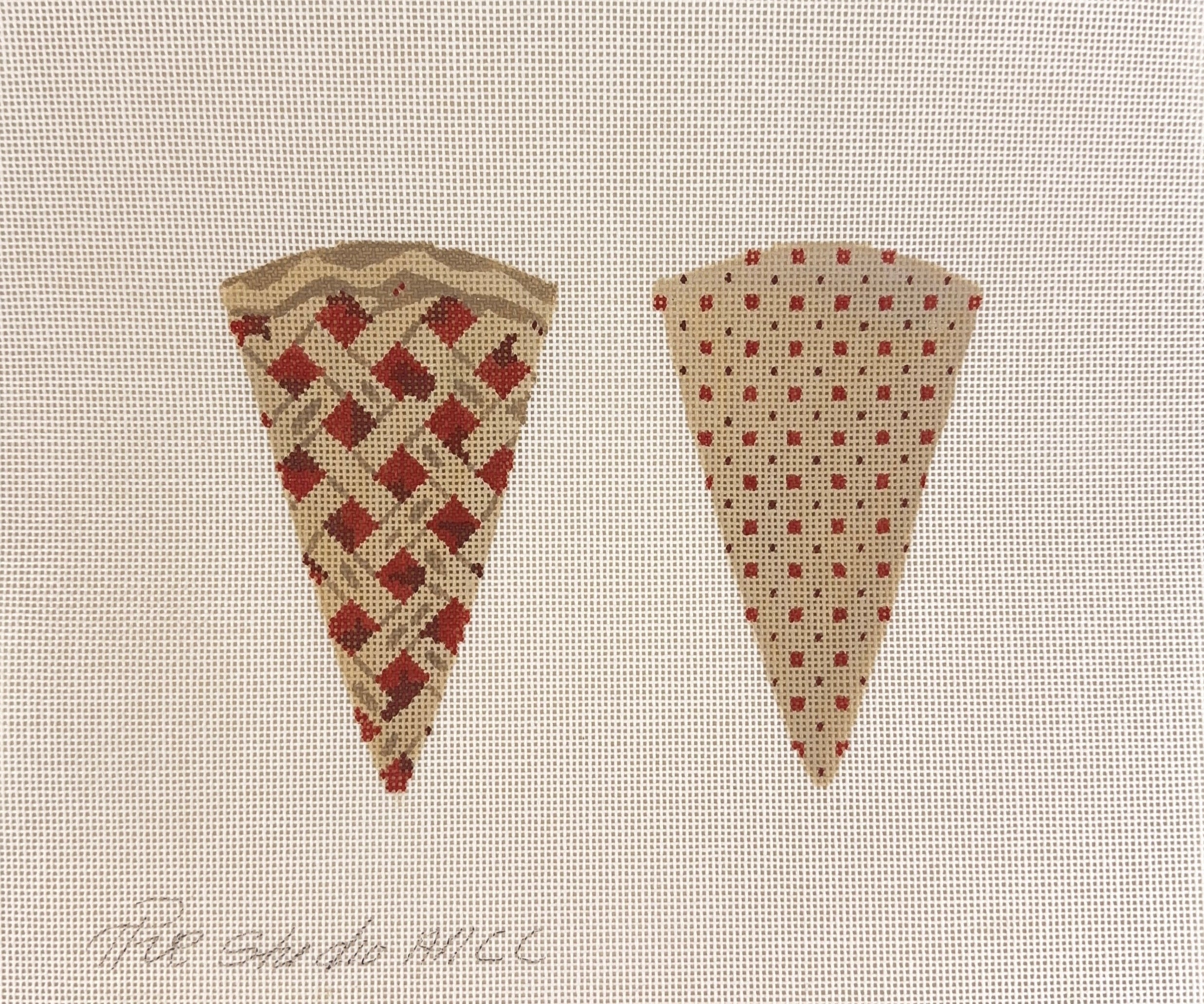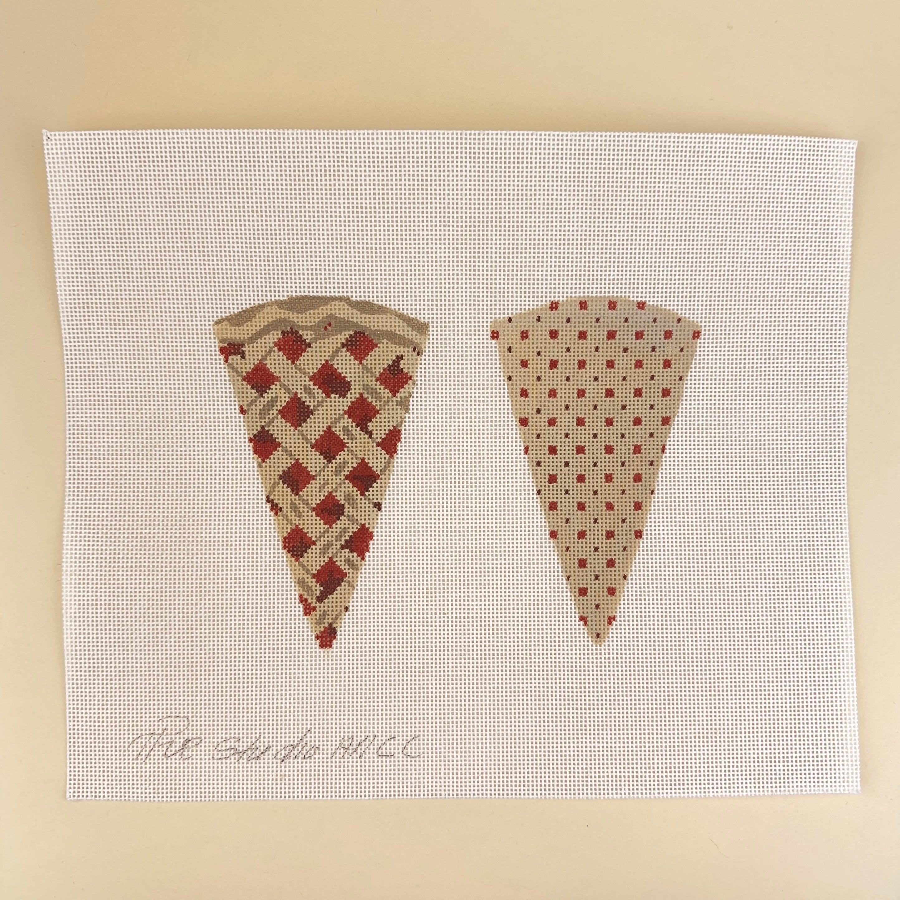 This hand painted needlepoint canvas by The Studio Midwest features a slice of cherry pie designed to be finished as a two sided scissor case.