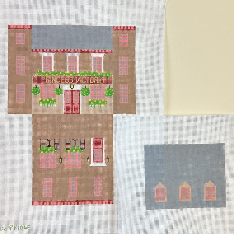 A beautiful hand painted needlepoint design from The Studio Midwest features a London Pub House called Princess Victoria. It is designed to be finished as a gusseted purse with a flap closure that is the roof piece of the purse.