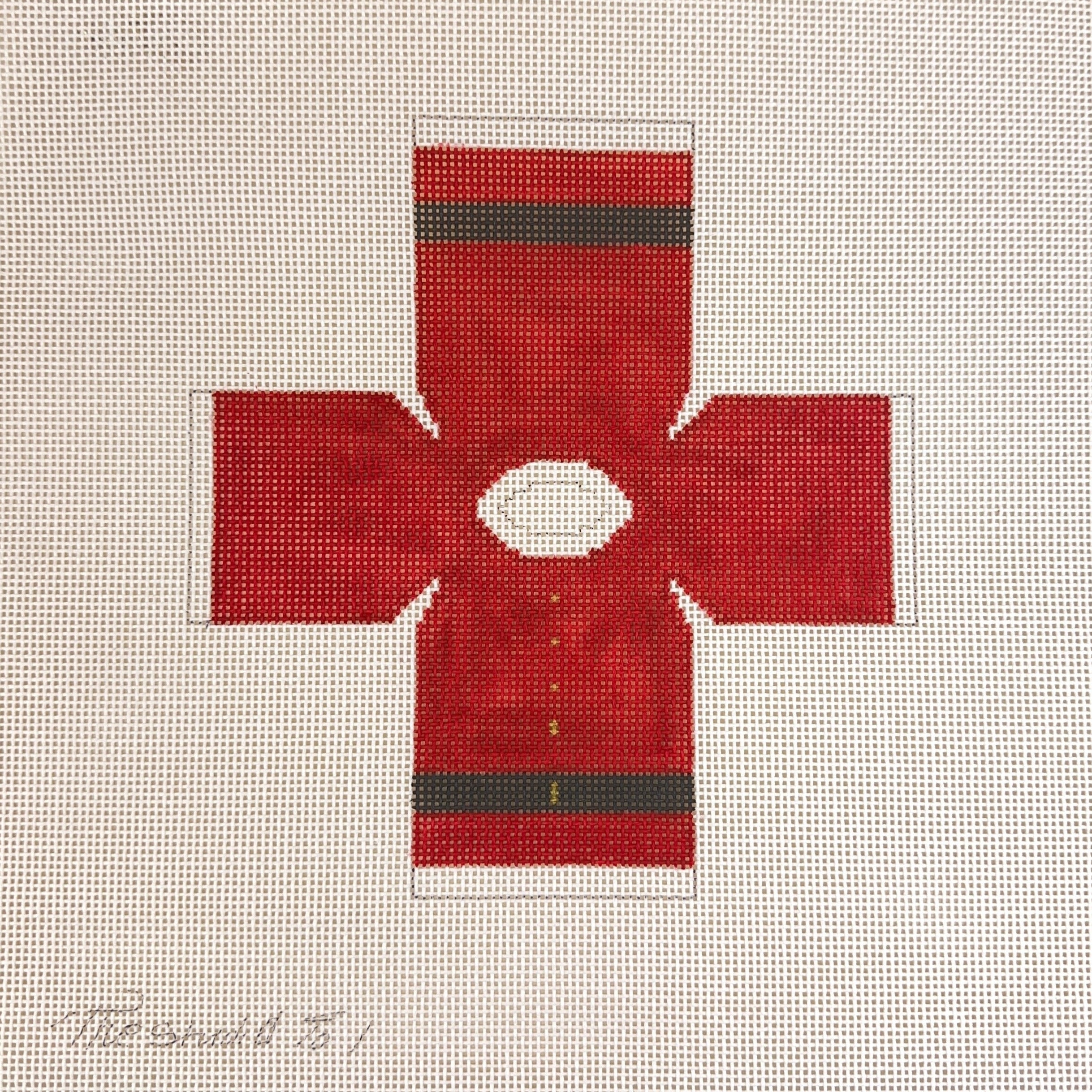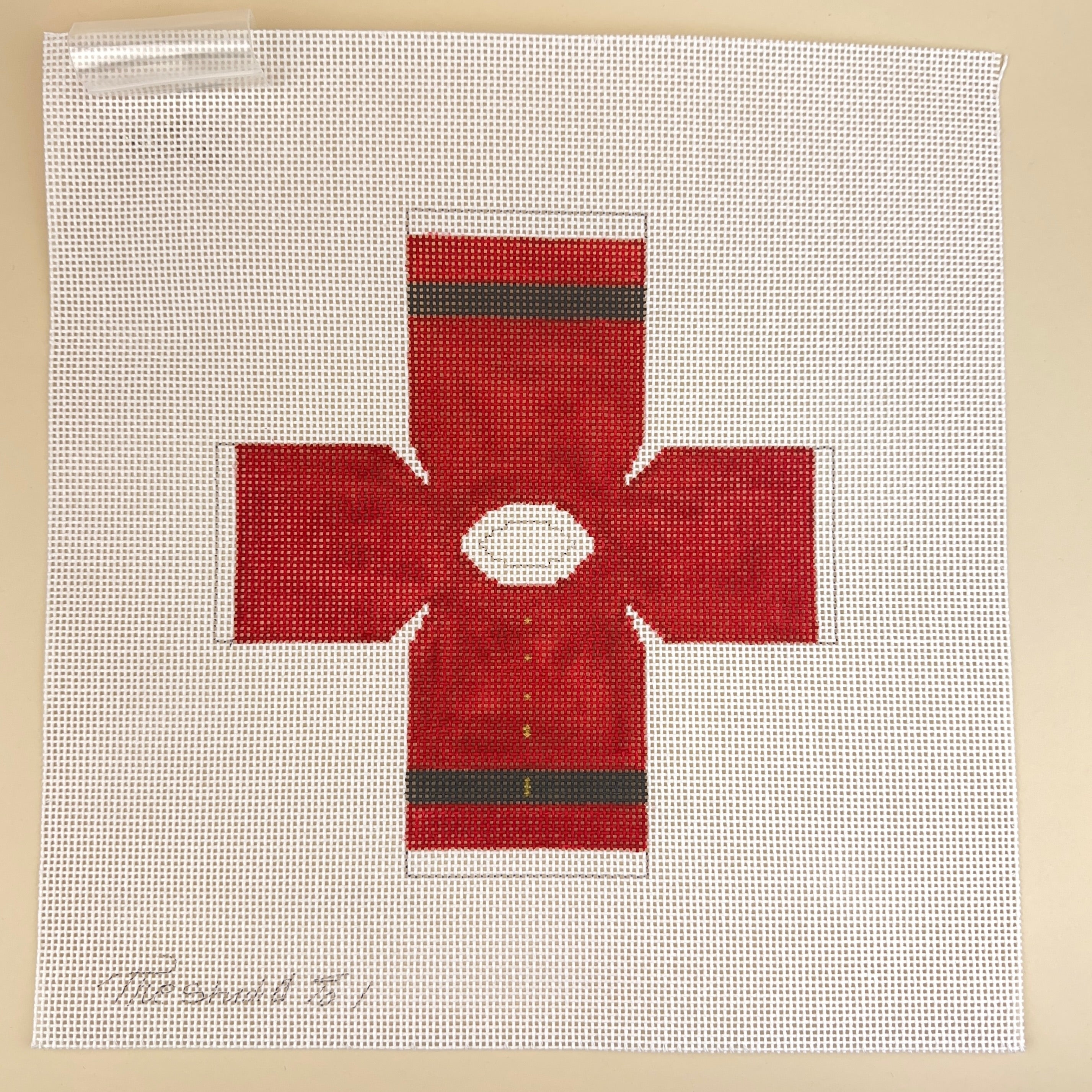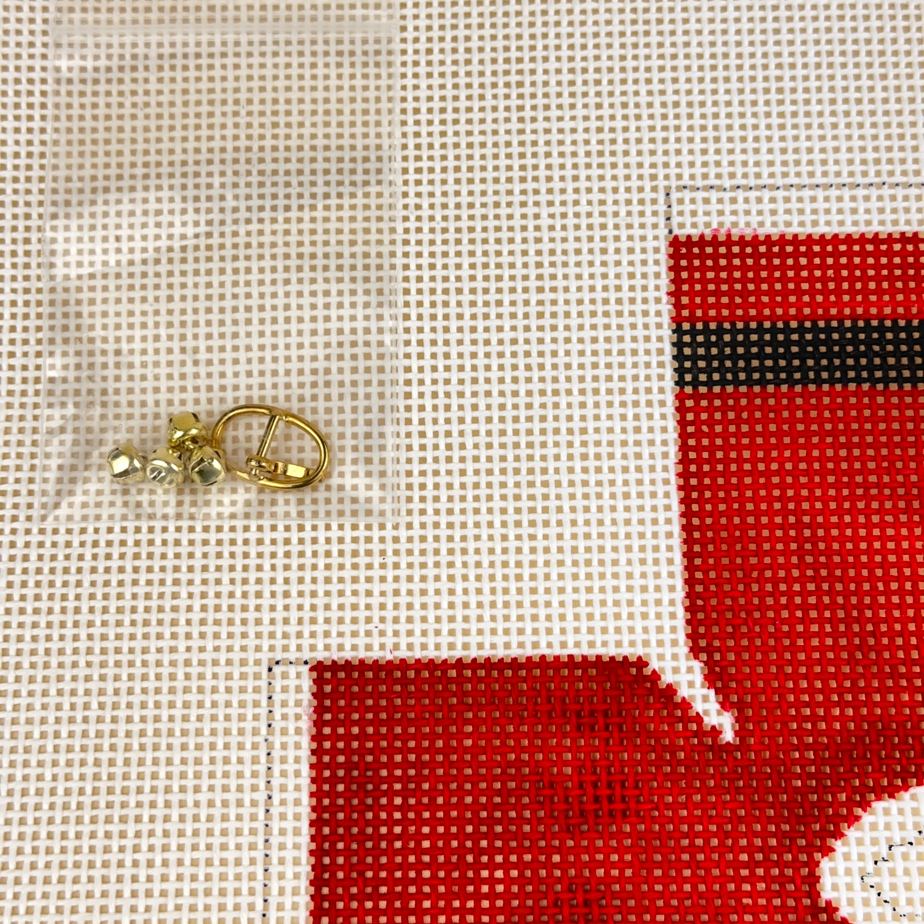 This hand painted needlepoint canvas by The Studio Midwest features Santa's jacket designed to be finished as a 3D piece. It includes little metal jingle bells for his buttons and a metal buckle for a special finishing touch.