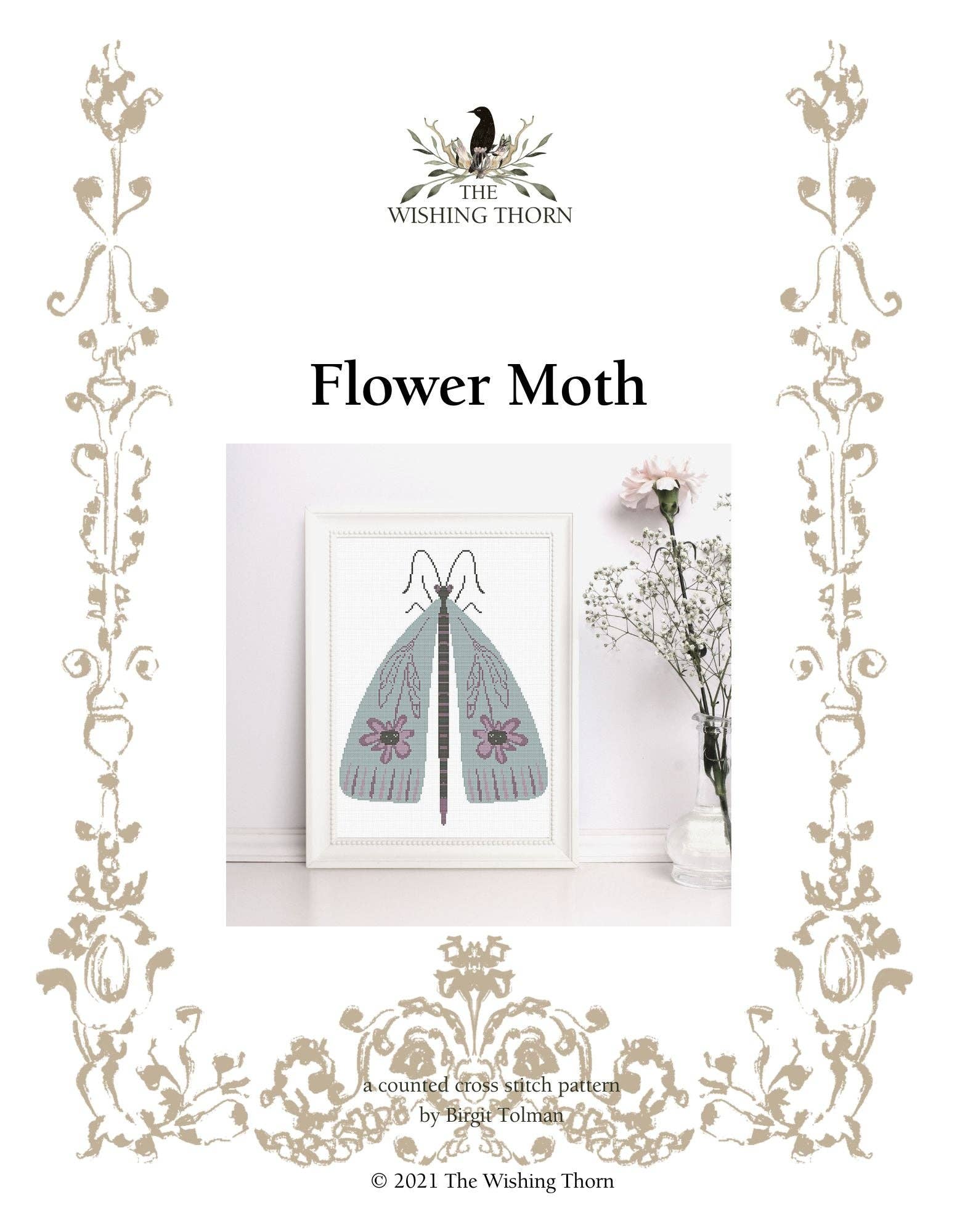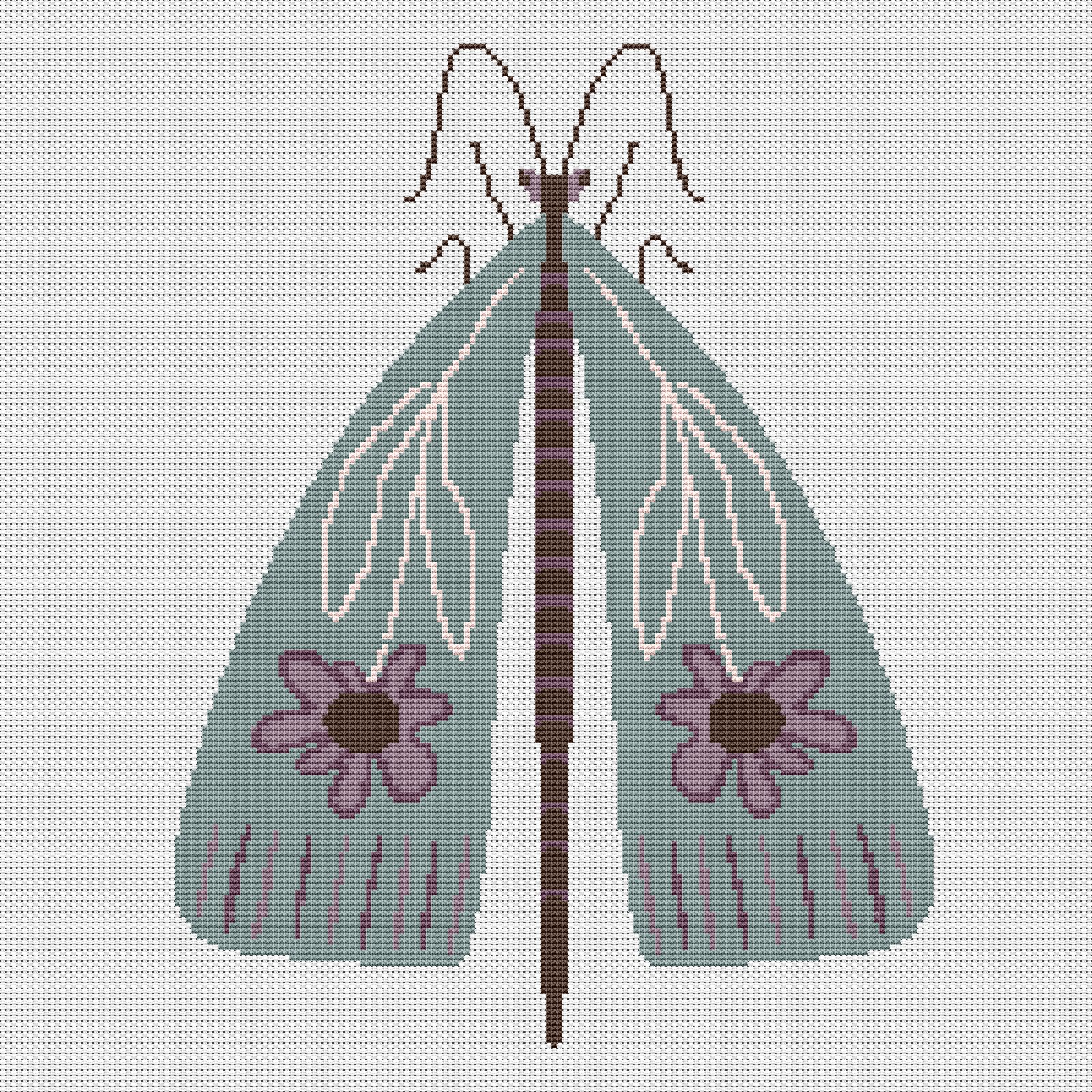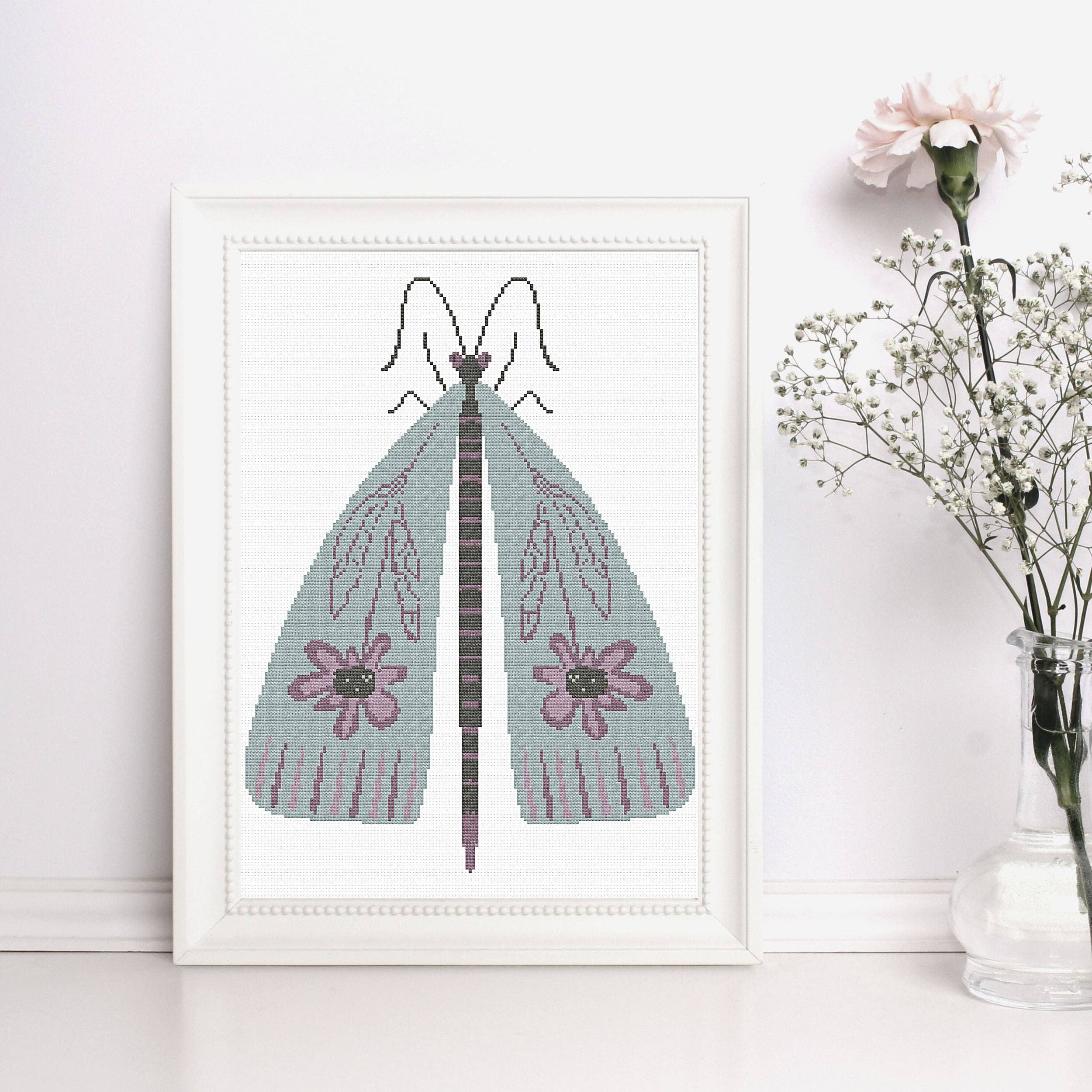 Easy to stitch moth beginner cross stitch pattern. It will look great in a children's room or any minimalist modern space. Part of a collection of bugs to be released. The pattern consists of a color image of the finished design, instructions, and a list of floss colors; A color & black and white symbol chart spread over several A4 sheets for printing.