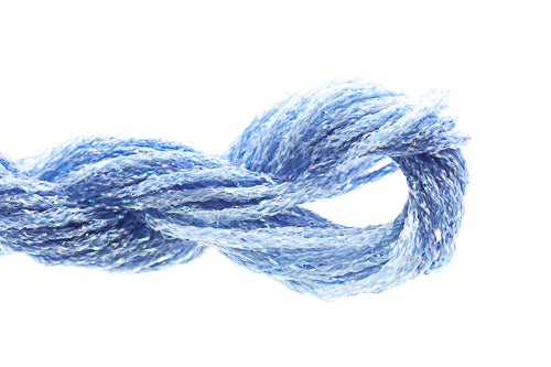 This is Kreinik Braid Overdyed #12 from ThreadworX in color 910031 China Blue. 1 ply on 18 mesh. About equivalent in size to #5 Perle Cotton. Pre-cut lengths of overdyed sparkle.
