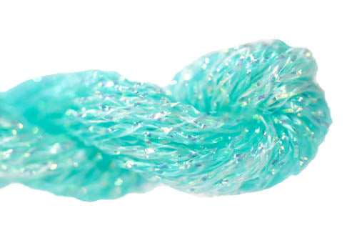 This is Kreinik Braid Overdyed #12 from ThreadworX in color 910095 Aqua. 1 ply on 18 mesh. About equivalent in size to #5 Perle Cotton. Pre-cut lengths of overdyed sparkle.