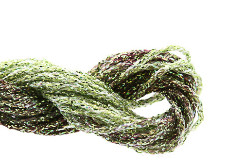 This is Kreinik Braid Overdyed #12 from ThreadworX in color 91069 Spanish Olives. 1 ply on 18 mesh. About equivalent in size to #5 Perle Cotton. Pre-cut lengths of overdyed sparkle.