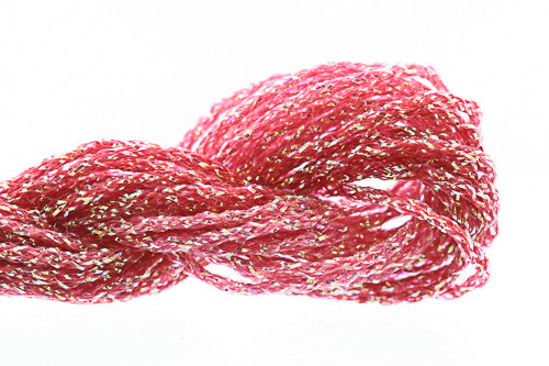 This is Kreinik Braid Overdyed #12 from ThreadworX in color 910960 Coral Renaissance. 1 ply on 18 mesh. About equivalent in size to #5 Perle Cotton. Pre-cut lengths of overdyed sparkle.