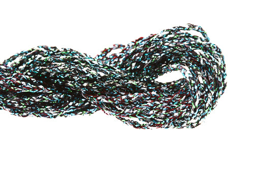 This is Kreinik Braid Overdyed #8 from ThreadworX in color 71138 Mosaic. 1 ply on 18 mesh for light coverage. About equivalent in size to #8 Perle Cotton. Pre-cut lengths of overdyed sparkle.