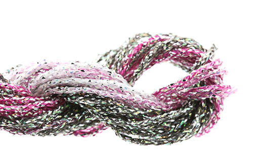 This is Kreinik Braid Overdyed #8 from ThreadworX in color 71145 Gray Flamingo. 1 ply on 18 mesh for light coverage. About equivalent in size to #8 Perle Cotton. Pre-cut lengths of overdyed sparkle.