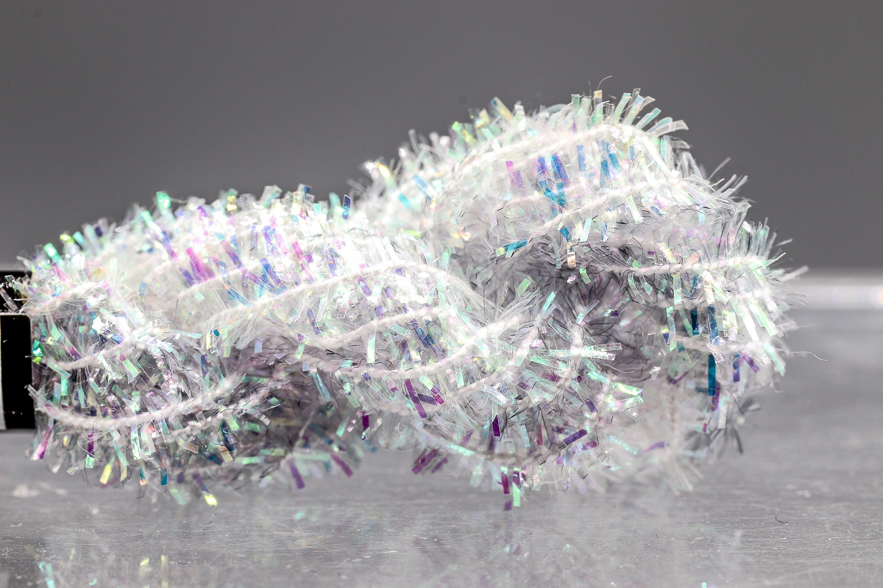 This is Ice Chenille from ThreadworX in color 3105 Ghost Gray. A light-reflecting, fuzzy chenille thread perfect for couching onto projects to add texture and dimension. It's a wonderful choice for stitching garlands, fuzzy creatures, and more!