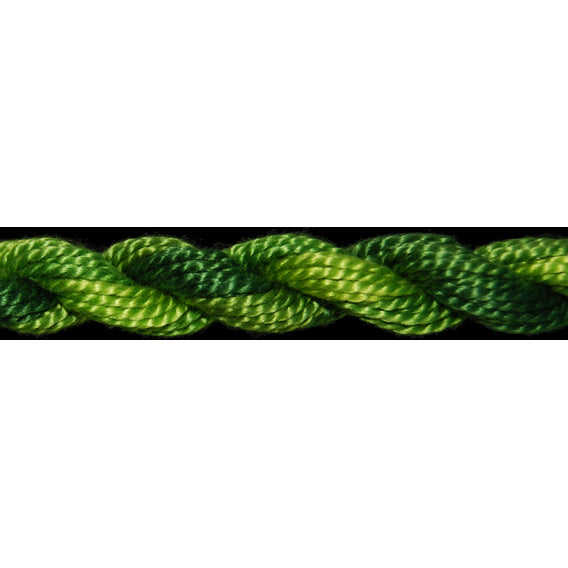 This is Overdyed Pearl Cotton #3 from ThreadworX in color 01047 Tropical Green. Hand-overdyed, mercerized 100% long-staple Egyptian Giza cotton.