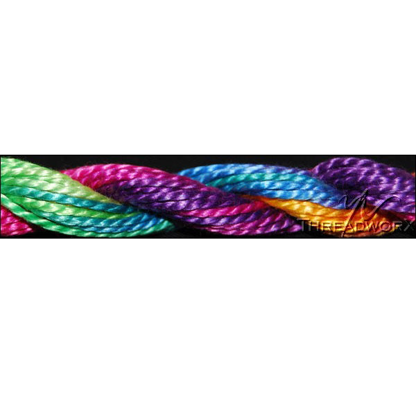 This is Overdyed Pearl Cotton #3 from ThreadworX in color 01154 Bradley's Balloons. Hand-overdyed, mercerized 100% long-staple Egyptian Giza cotton.