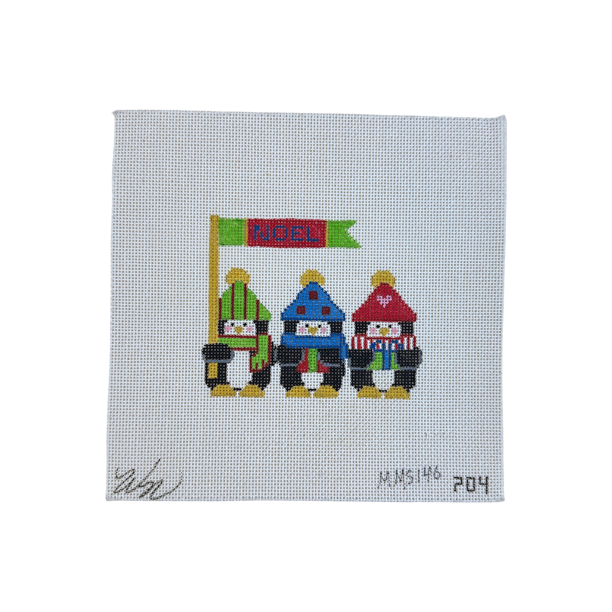 This hand painted needlepoint canvas features a trio of penguins in hats and scarves with a Noel banner.