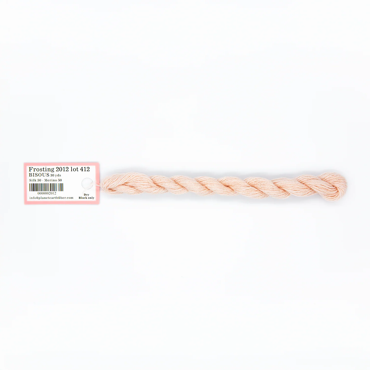 This is Bisous from Planet Earth in color 2012 Frosting. Bisous is a multipurpose silk-wool blend from Tilli Tomas. Use as-is for very light coverage on 18 mesh or for embroidery. Use additional plies to build up coverage on canvas - for full coverage, we recommend 2 plies on 18 mesh and 3 plies on 13 mesh.