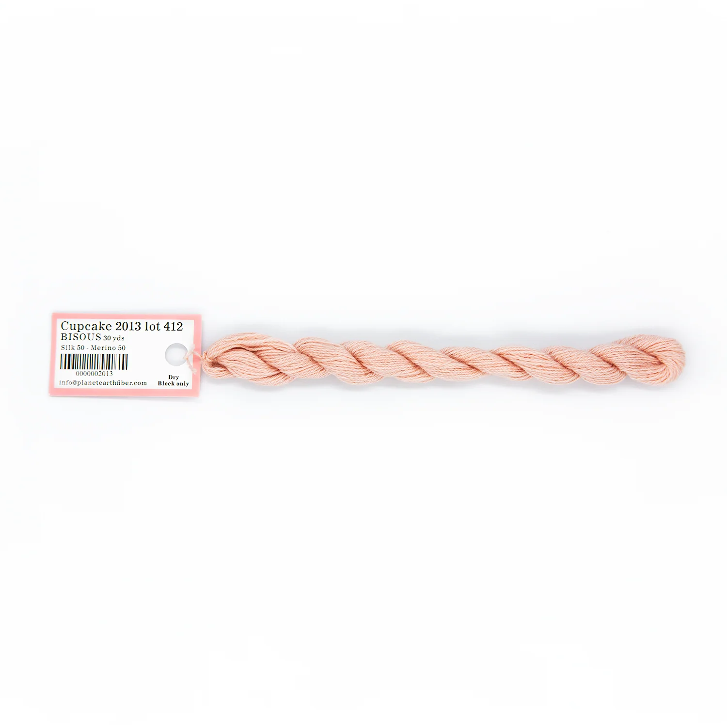 This is Bisous from Planet Earth in color 2013 Cupcake. Bisous is a multipurpose silk-wool blend from Tilli Tomas. Use as-is for very light coverage on 18 mesh or for embroidery. Use additional plies to build up coverage on canvas - for full coverage, we recommend 2 plies on 18 mesh and 3 plies on 13 mesh.
