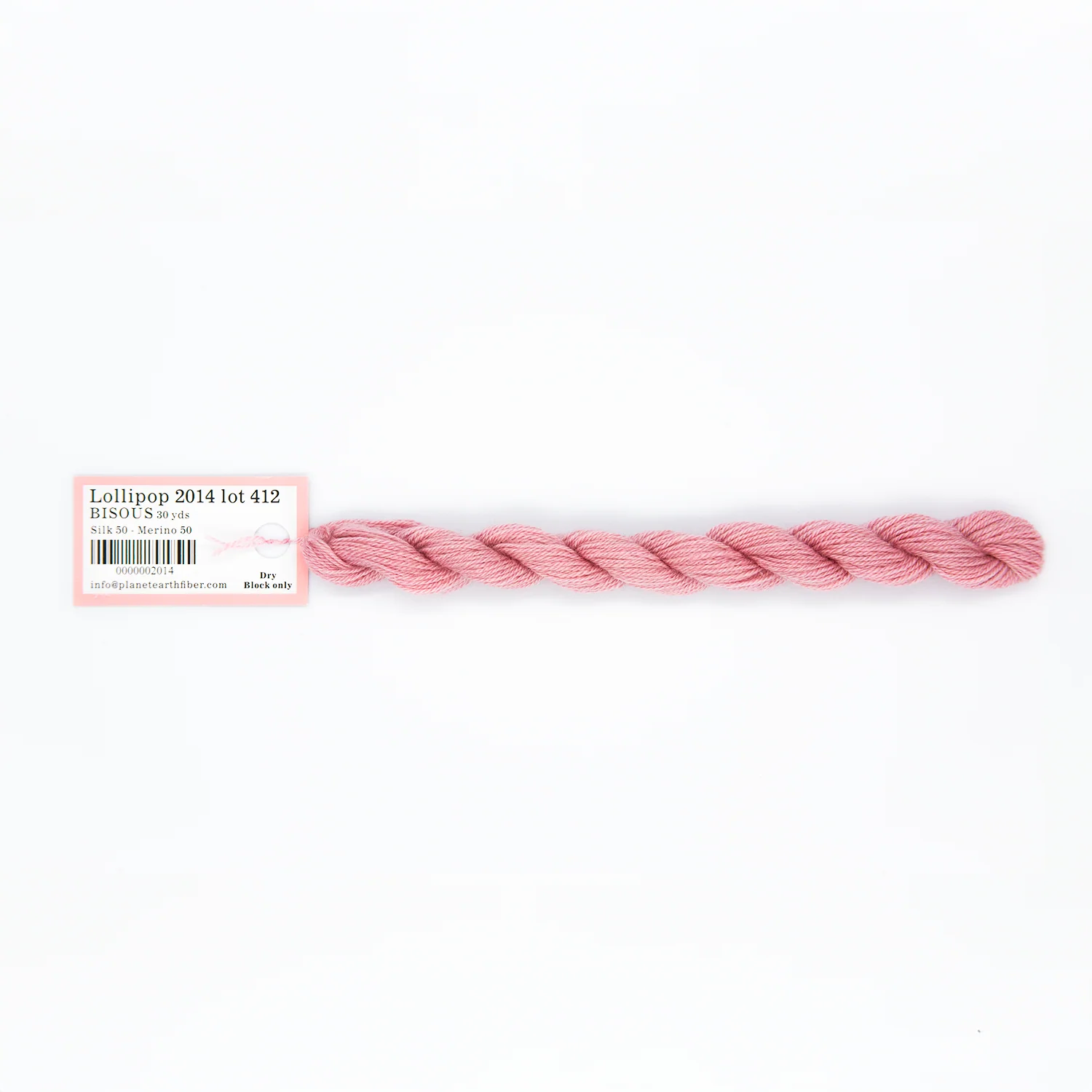 This is Bisous from Planet Earth in color 2014 Lollipop. Bisous is a multipurpose silk-wool blend from Tilli Tomas. Use as-is for very light coverage on 18 mesh or for embroidery. Use additional plies to build up coverage on canvas - for full coverage, we recommend 2 plies on 18 mesh and 3 plies on 13 mesh.