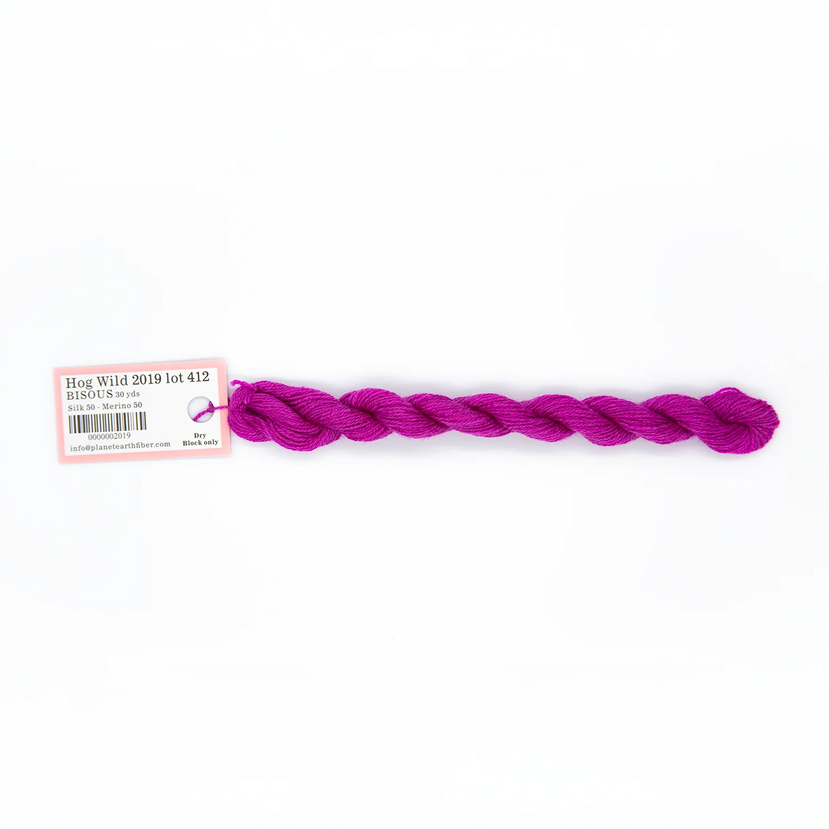 This is Bisous from Planet Earth in color 2019 Hog Wild. Bisous is a multipurpose silk-wool blend from Tilli Tomas. Use as-is for very light coverage on 18 mesh or for embroidery. Use additional plies to build up coverage on canvas - for full coverage, we recommend 2 plies on 18 mesh and 3 plies on 13 mesh.