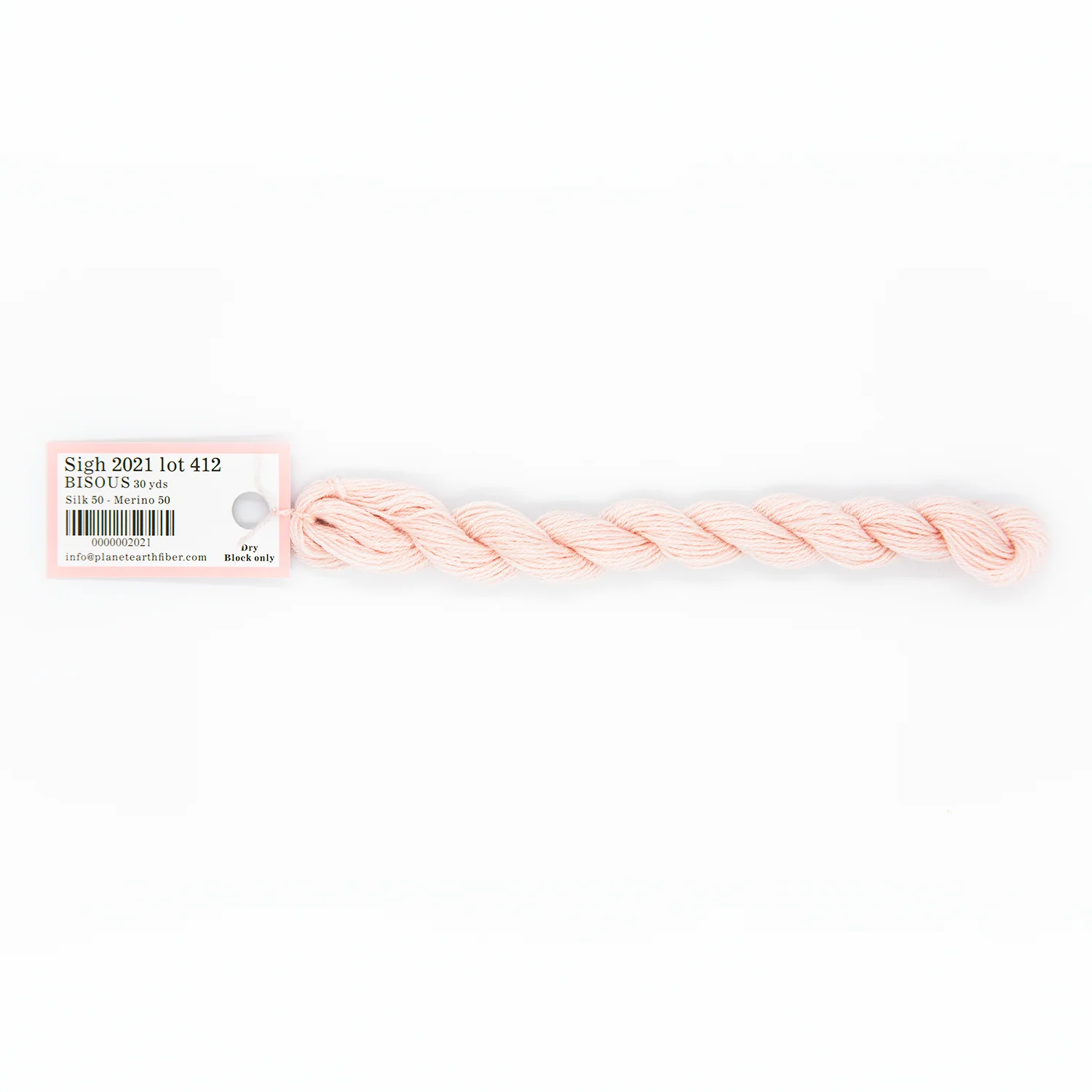 This is Bisous from Planet Earth in color 2021 Sigh. Bisous is a multipurpose silk-wool blend from Tilli Tomas. Use as-is for very light coverage on 18 mesh or for embroidery. Use additional plies to build up coverage on canvas - for full coverage, we recommend 2 plies on 18 mesh and 3 plies on 13 mesh.