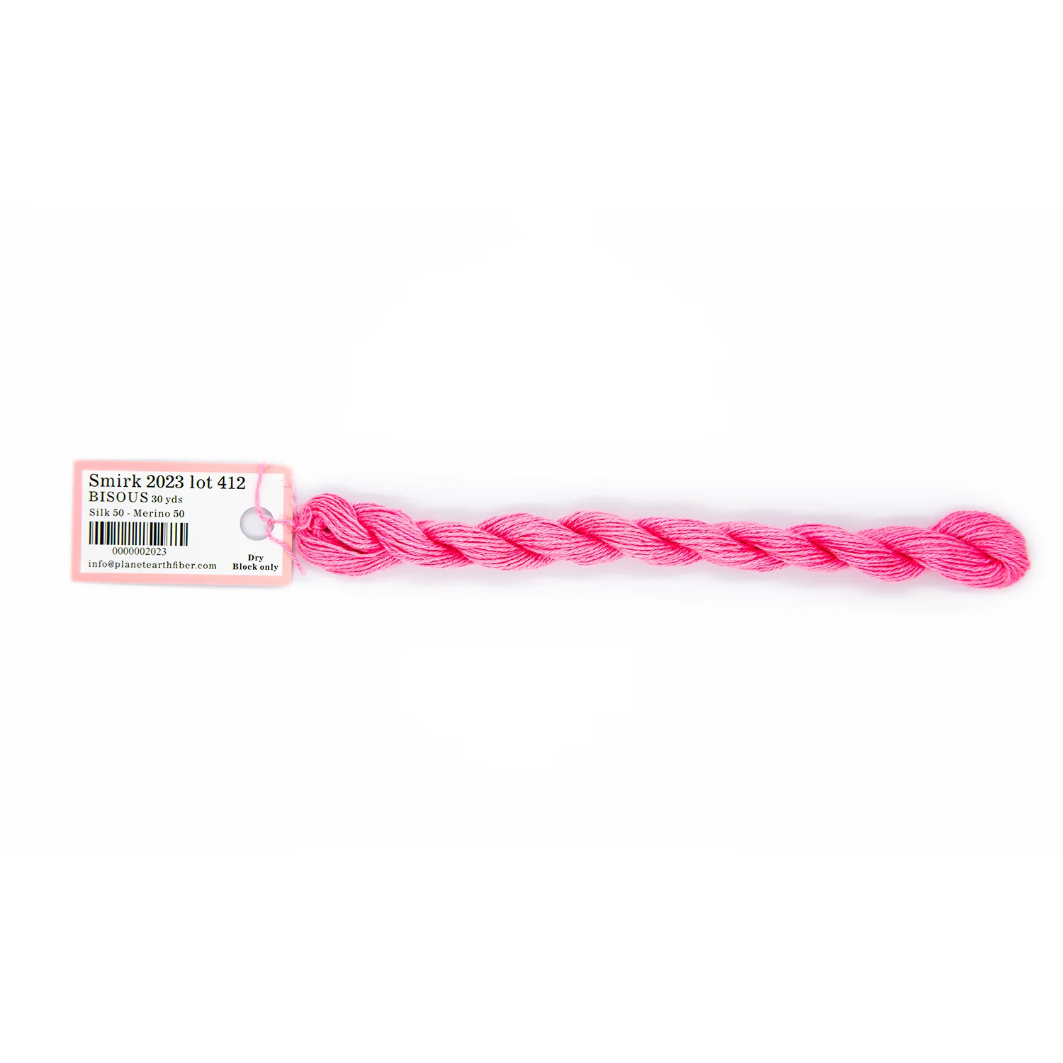 This is Bisous from Planet Earth in color 2023 Smirk. Bisous is a multipurpose silk-wool blend from Tilli Tomas. Use as-is for very light coverage on 18 mesh or for embroidery. Use additional plies to build up coverage on canvas - for full coverage, we recommend 2 plies on 18 mesh and 3 plies on 13 mesh.