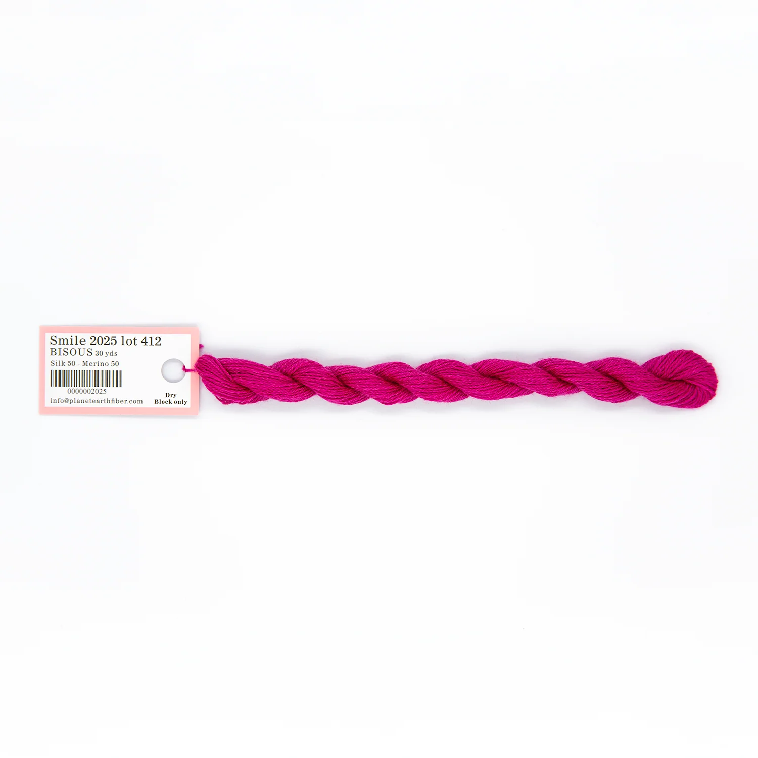 This is Bisous from Planet Earth in color 2025 Smile. Bisous is a multipurpose silk-wool blend from Tilli Tomas. Use as-is for very light coverage on 18 mesh or for embroidery. Use additional plies to build up coverage on canvas - for full coverage, we recommend 2 plies on 18 mesh and 3 plies on 13 mesh.