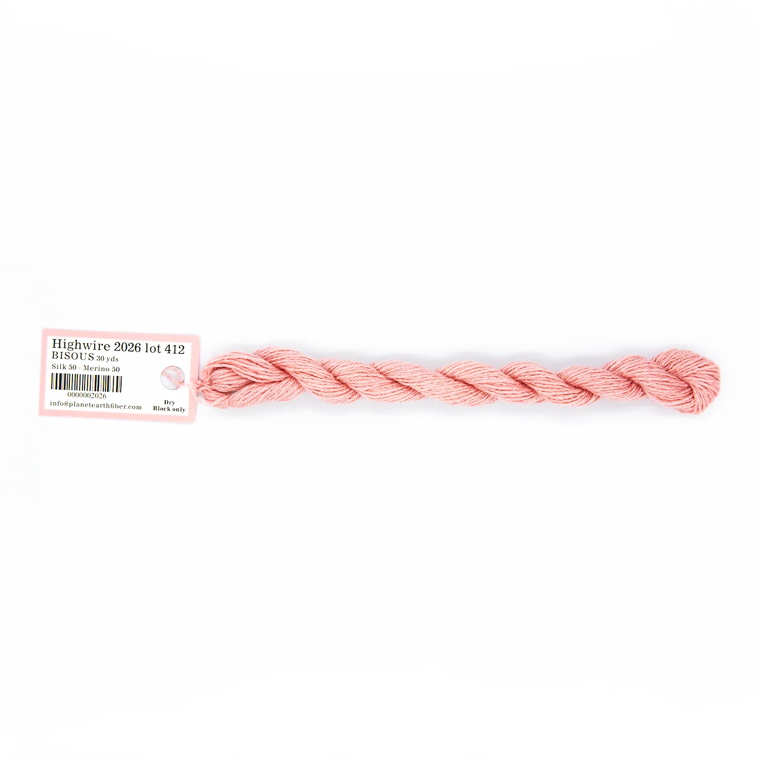 This is Bisous from Planet Earth in color 2026 Highwire. Bisous is a multipurpose silk-wool blend from Tilli Tomas. Use as-is for very light coverage on 18 mesh or for embroidery. Use additional plies to build up coverage on canvas - for full coverage, we recommend 2 plies on 18 mesh and 3 plies on 13 mesh.