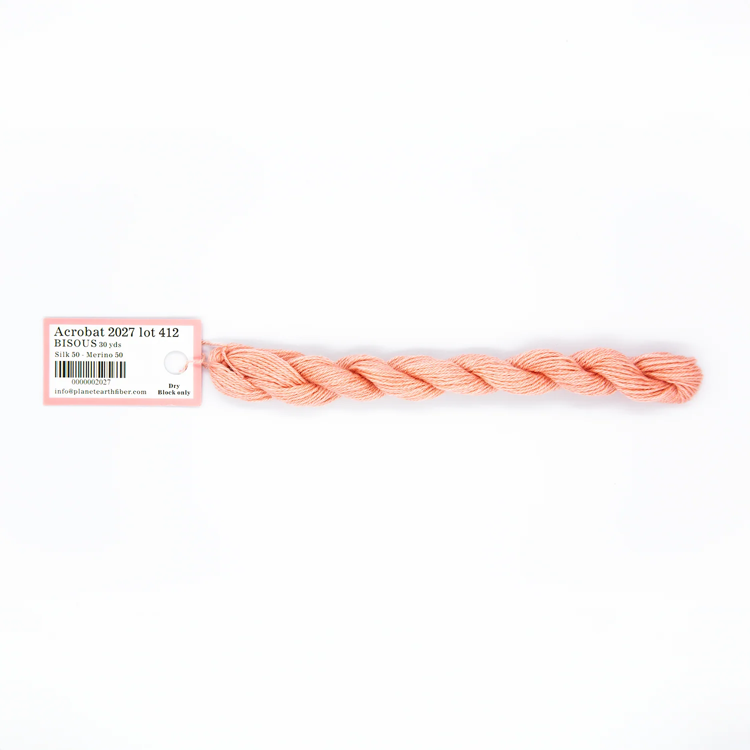This is Bisous from Planet Earth in color 2027 Acrobat. Bisous is a multipurpose silk-wool blend from Tilli Tomas. Use as-is for very light coverage on 18 mesh or for embroidery. Use additional plies to build up coverage on canvas - for full coverage, we recommend 2 plies on 18 mesh and 3 plies on 13 mesh.
