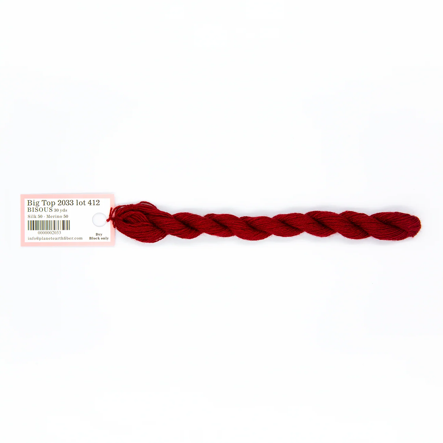 This is Bisous from Planet Earth in color 2033 Big Top. Bisous is a multipurpose silk-wool blend from Tilli Tomas. Use as-is for very light coverage on 18 mesh or for embroidery. Use additional plies to build up coverage on canvas - for full coverage, we recommend 2 plies on 18 mesh and 3 plies on 13 mesh.