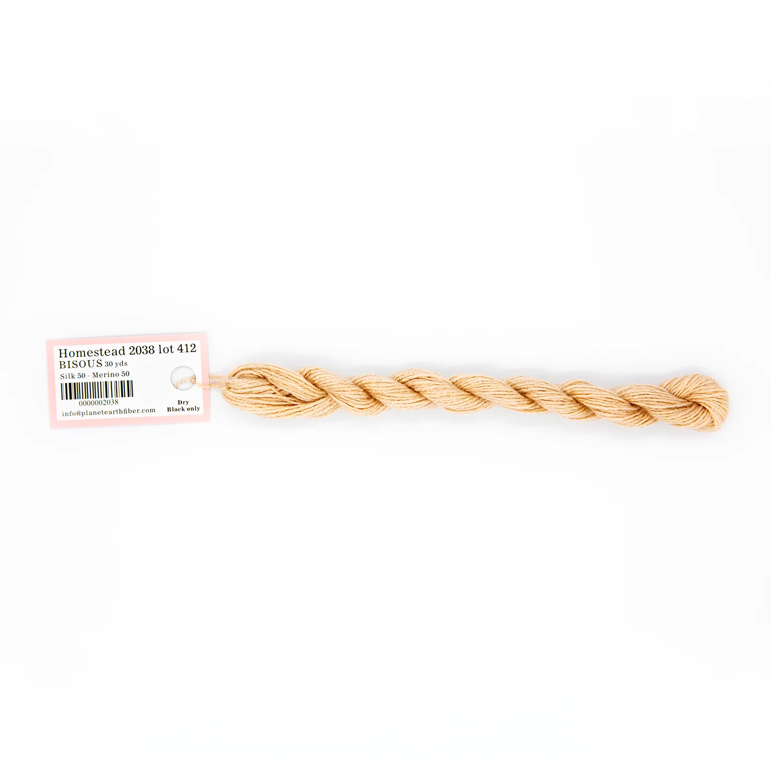 This is Bisous from Planet Earth in color 2038 Homestead. Bisous is a multipurpose silk-wool blend from Tilli Tomas. Use as-is for very light coverage on 18 mesh or for embroidery. Use additional plies to build up coverage on canvas - for full coverage, we recommend 2 plies on 18 mesh and 3 plies on 13 mesh.