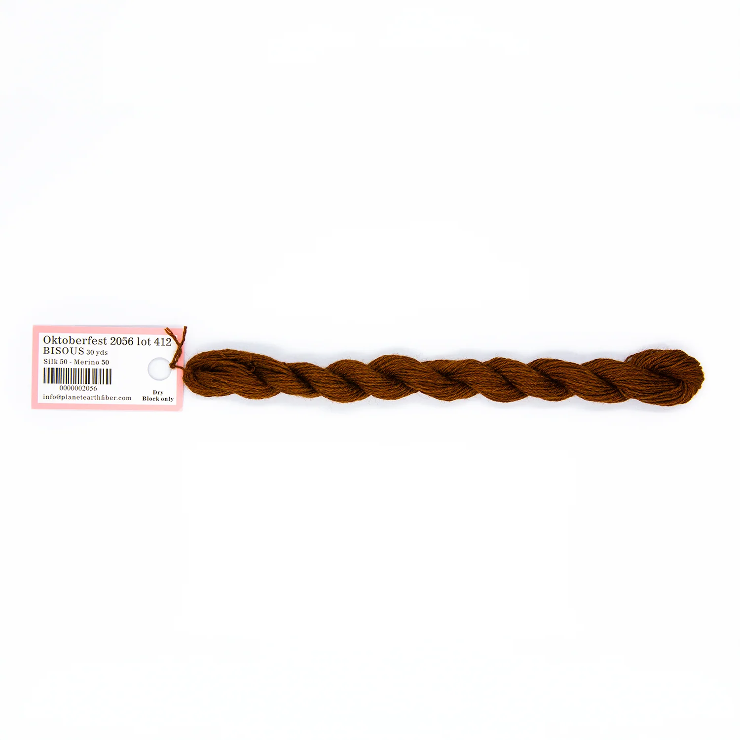 This is Bisous from Planet Earth in color 2056 Oktoberfest. Bisous is a multipurpose silk-wool blend from Tilli Tomas. Use as-is for very light coverage on 18 mesh or for embroidery. Use additional plies to build up coverage on canvas - for full coverage, we recommend 2 plies on 18 mesh and 3 plies on 13 mesh.