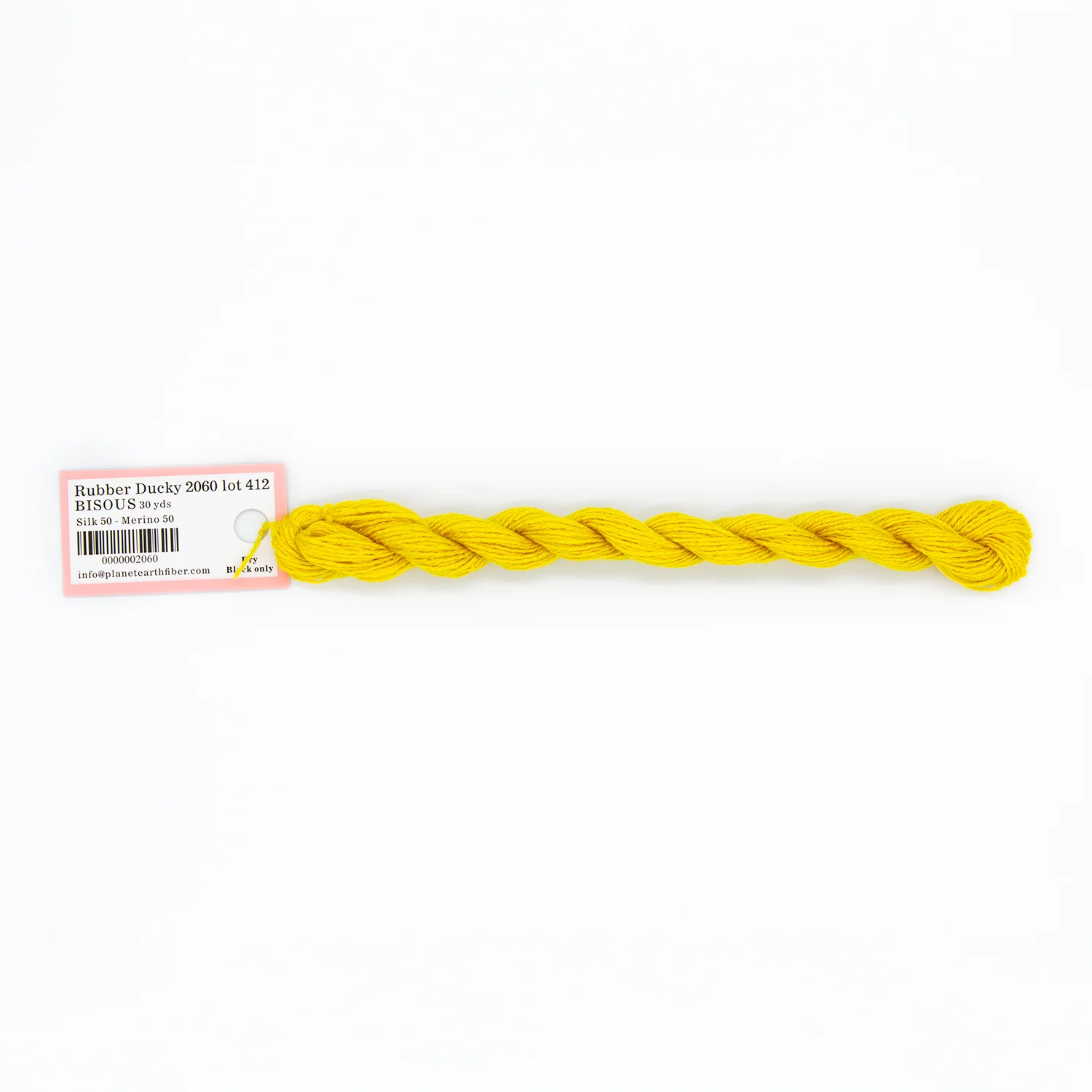 This is Bisous from Planet Earth in color 2060 Rubber Ducky. Bisous is a multipurpose silk-wool blend from Tilli Tomas. Use as-is for very light coverage on 18 mesh or for embroidery. Use additional plies to build up coverage on canvas - for full coverage, we recommend 2 plies on 18 mesh and 3 plies on 13 mesh.