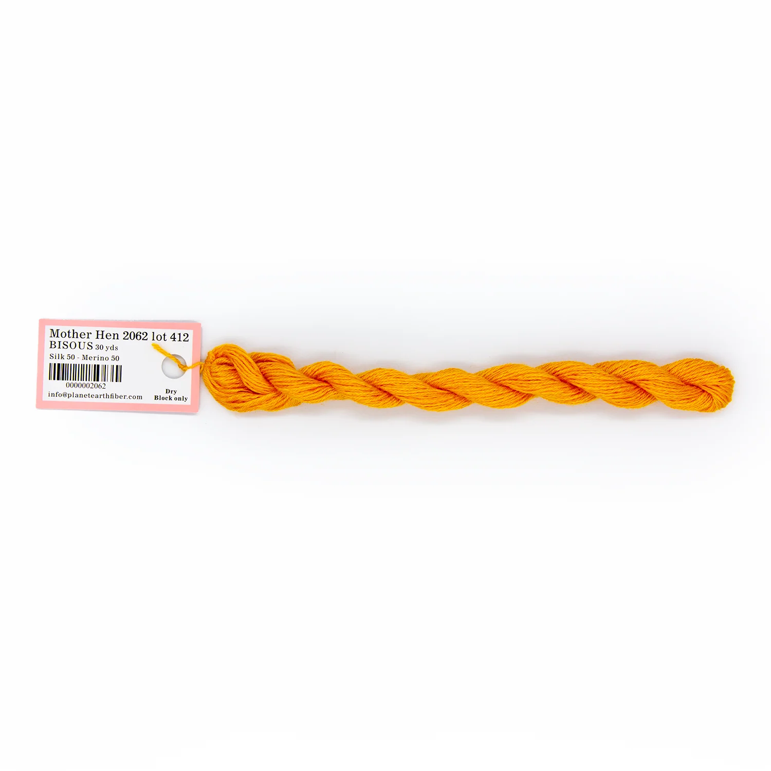This is Bisous from Planet Earth in color 2062 Mother Hen. Bisous is a multipurpose silk-wool blend from Tilli Tomas. Use as-is for very light coverage on 18 mesh or for embroidery. Use additional plies to build up coverage on canvas - for full coverage, we recommend 2 plies on 18 mesh and 3 plies on 13 mesh.