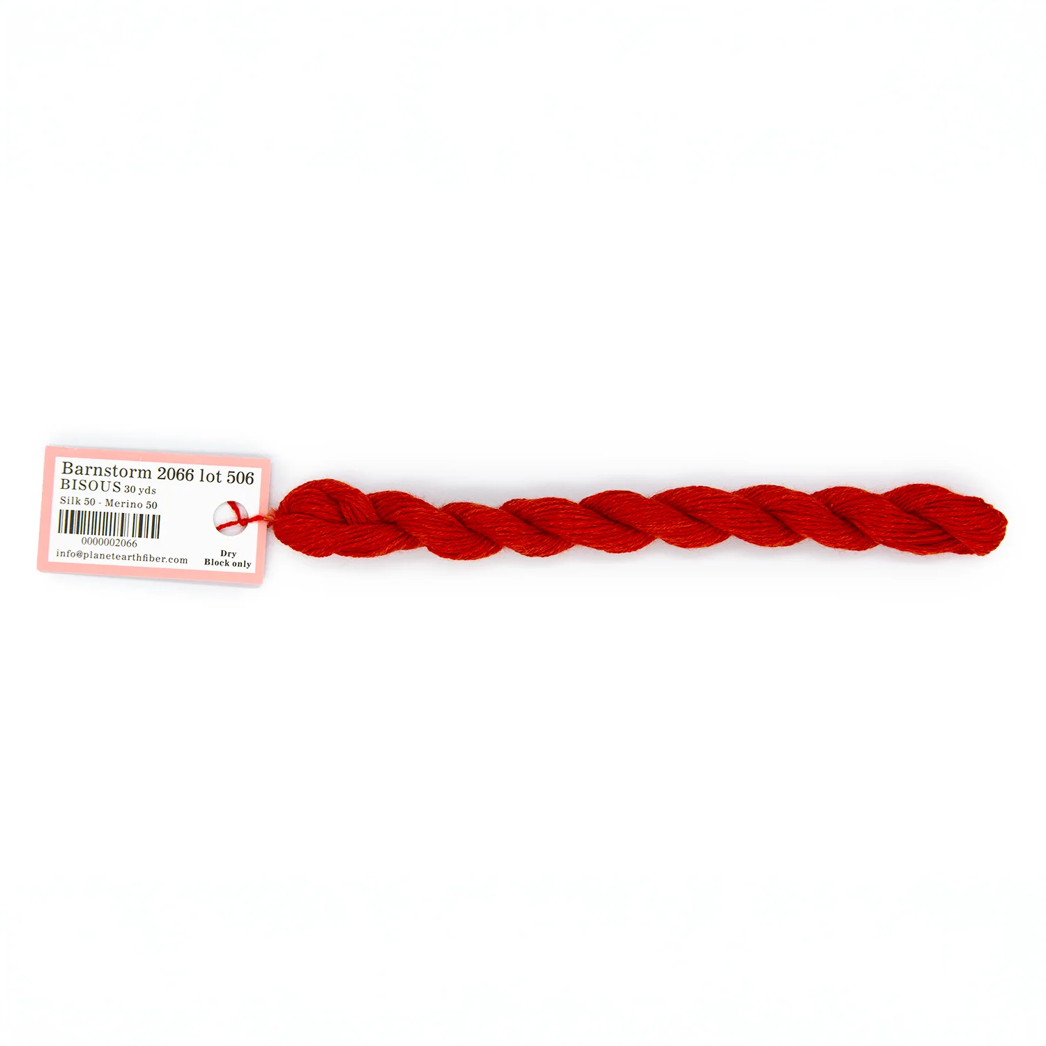 This is Bisous from Planet Earth in color 2066 Barnstorm. Bisous is a multipurpose silk-wool blend from Tilli Tomas. Use as-is for very light coverage on 18 mesh or for embroidery. Use additional plies to build up coverage on canvas - for full coverage, we recommend 2 plies on 18 mesh and 3 plies on 13 mesh.