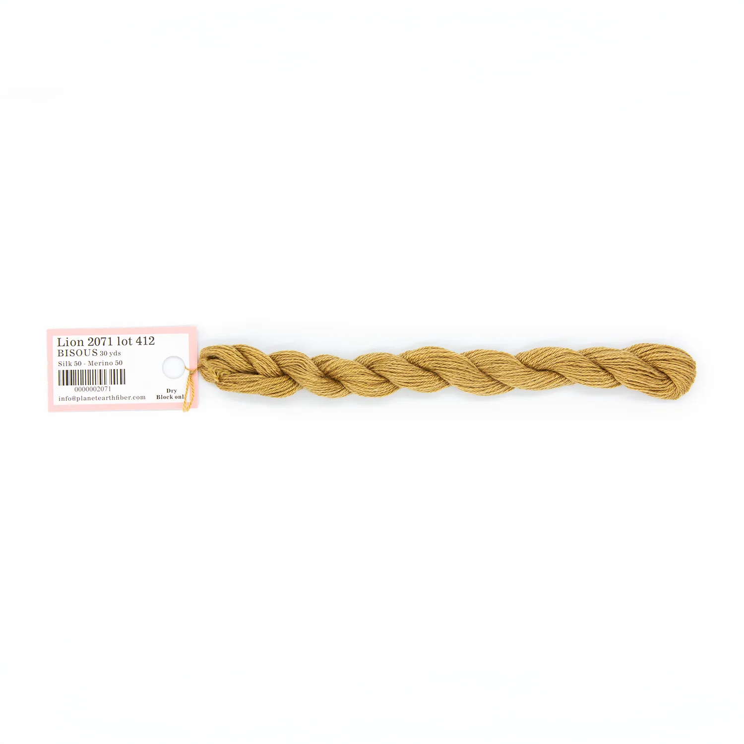 This is Bisous from Planet Earth in color 2071 Lion. Bisous is a multipurpose silk-wool blend from Tilli Tomas. Use as-is for very light coverage on 18 mesh or for embroidery. Use additional plies to build up coverage on canvas - for full coverage, we recommend 2 plies on 18 mesh and 3 plies on 13 mesh.