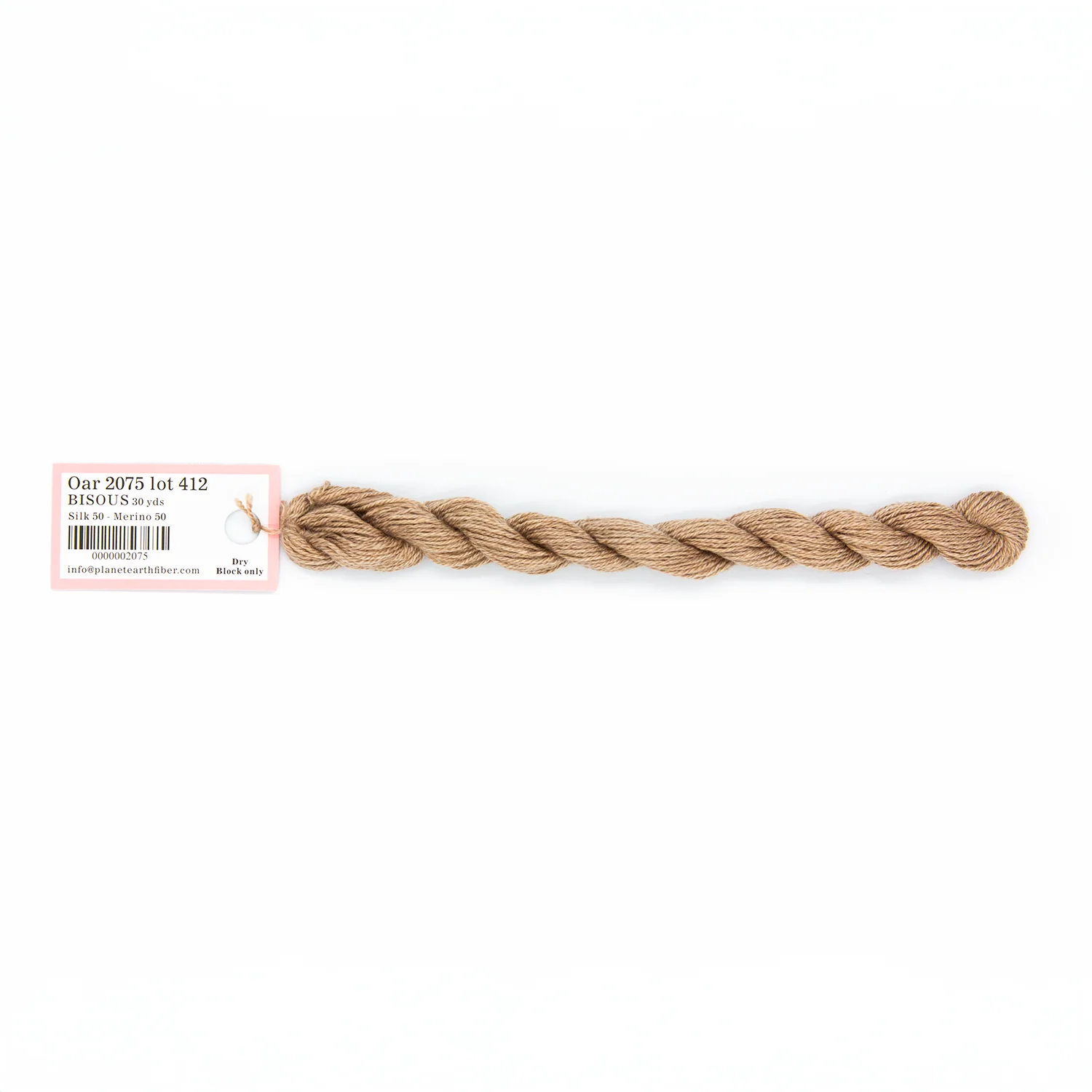 This is Bisous from Planet Earth in color 2075 Oar. Bisous is a multipurpose silk-wool blend from Tilli Tomas. Use as-is for very light coverage on 18 mesh or for embroidery. Use additional plies to build up coverage on canvas - for full coverage, we recommend 2 plies on 18 mesh and 3 plies on 13 mesh.