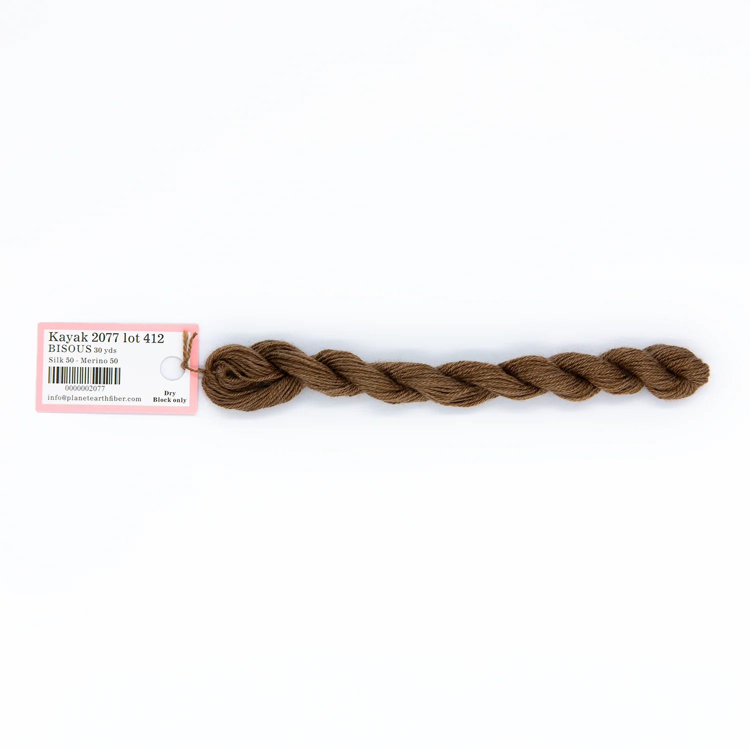 This is Bisous from Planet Earth in color 2077 Kayak. Bisous is a multipurpose silk-wool blend from Tilli Tomas. Use as-is for very light coverage on 18 mesh or for embroidery. Use additional plies to build up coverage on canvas - for full coverage, we recommend 2 plies on 18 mesh and 3 plies on 13 mesh.